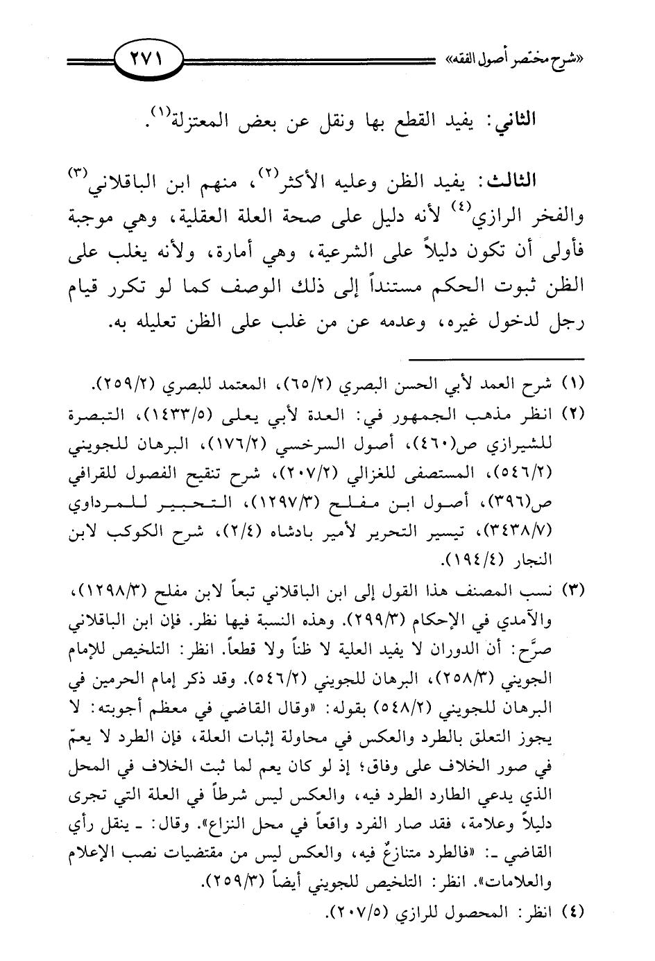 (¬3) نسب المصنف هذا القول إلى ابن الباقلاني تبعًا لابن مفلح (3/ 1298)، والآمدي في الإحكام (3/ 299). وهذه النسبة فيها نظر. فإن ابن الباقلاني صرَّح: أن الدوران لا يفيد العلية لا ظنًّا ولا قطعًا. انظر: التلخيص للإمام الجويني (3/ 258)، البرهان للجويني (2/ 546). وقد ذكر إمام الحرمين في البرهان للجويني (2/ 548) بقوله: "وقال القاضي في معظم أجوبته: لا يجوز التعلق بالطرد والعكس في محاولة إثبات العلة، فإن الطرد لا يعمّ في صور الخلاف على وفاق؛ إذ لو كان يعم لما ثبت الخلاف في المحل الذي يدعي الطارد الطرد فيه، والعكس ليس شرطًا في العلة التي تجرى دليلًا وعلامة، فقد صار الفرد واقعًا في محل النزاع". وقال: -نقل رأي القاضي-: "فالطرد متنازعٌ فيه، والعكس ليس من مقتضيات نصب الإعلام والعلامات". انظر: التلخيص للجويني أيضًا (3/ 259).