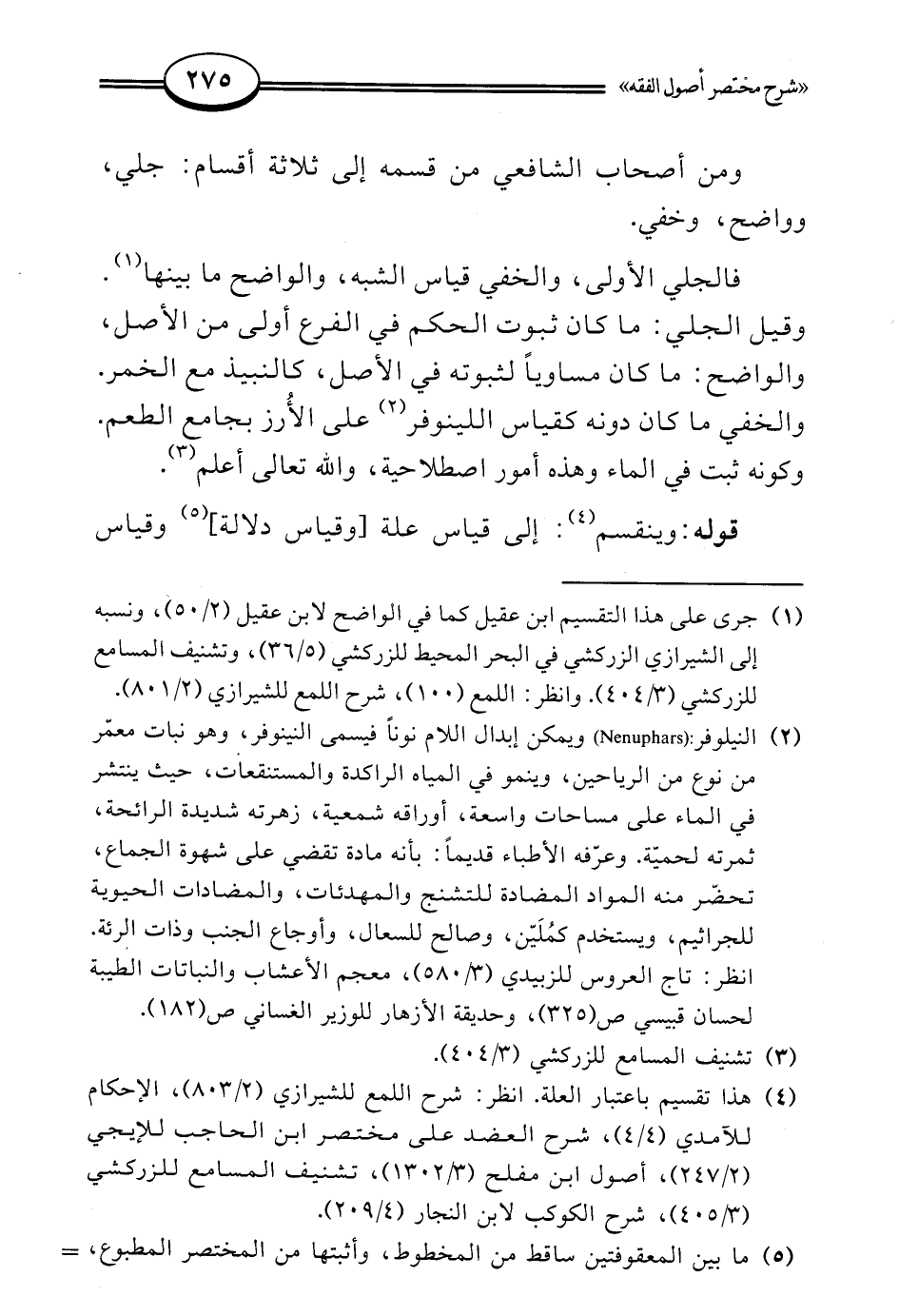 وقيل الجلي: ما كان ثبوت الحكم في الفرع أولى من الأصل، والواضح: ما كان مساويًا لثبوته في الأصل، كالنبيذ مع الخمر. والخفي ما كان دونه كقياس اللينوفر (¬2) على الأُرز بجامع الطعم. وكونه ثبت في الماء وهذه أمور اصطلاحية، والله تعالى أعلم (¬3).