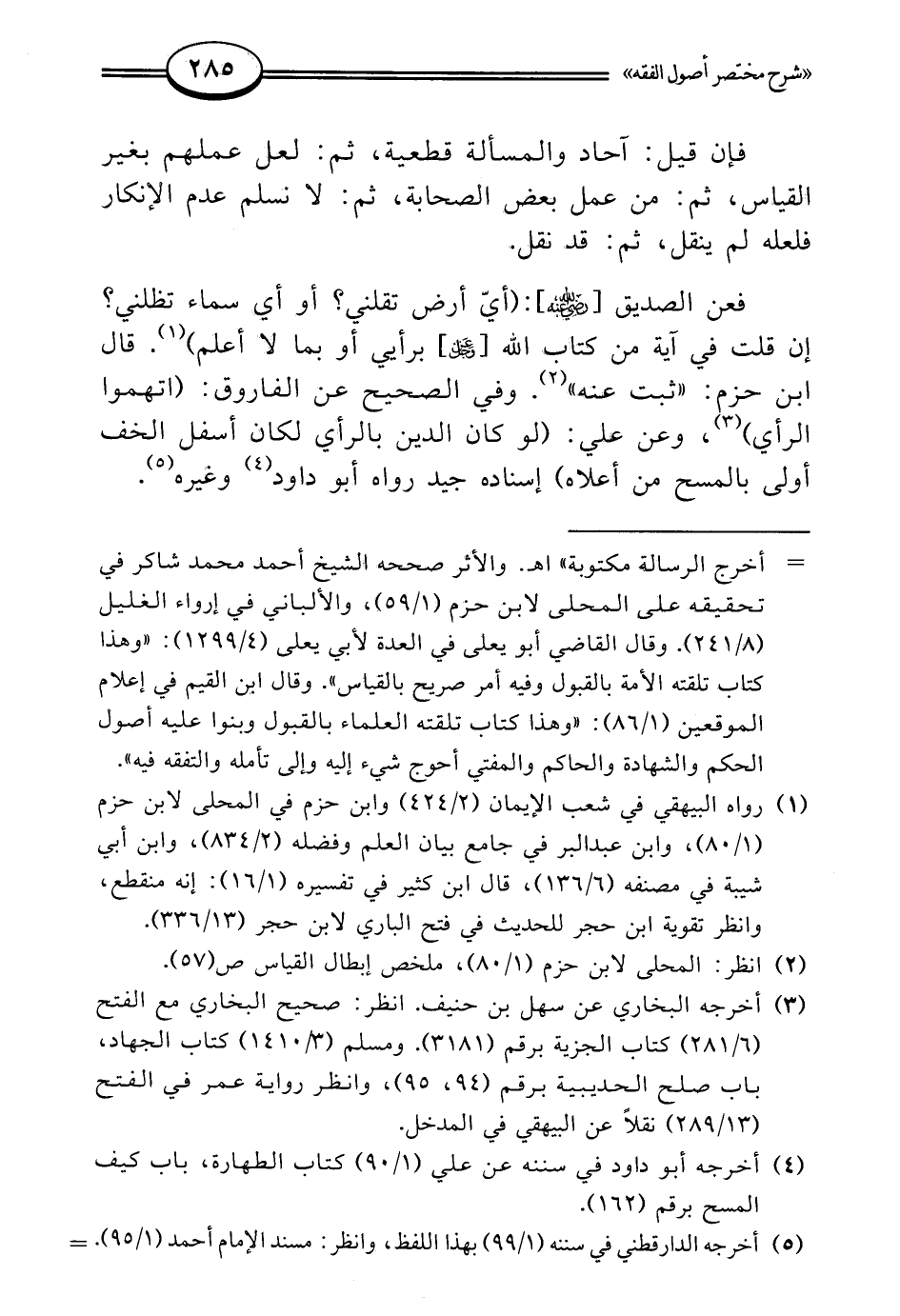 فعن الصديق [- رضي الله عنه -]: (أيّ أرض تقلني؟ أو أي سماء تظلني؟ إن قلت في آية من كتاب الله [عز وجل] برأيي أو بما لا أعلم) (¬1). قال ابن حزم: "ثبت عنه" (¬2). وفي الصحيح عن الفاروق: (اتهموا الرأي) (¬3)، وعن علي: (لو كان الدين بالرأي لكان أسفل الخف أولى بالمسح من أعلاه) إسناده جيد رواه أبو داود (¬4) وغيره (¬5).