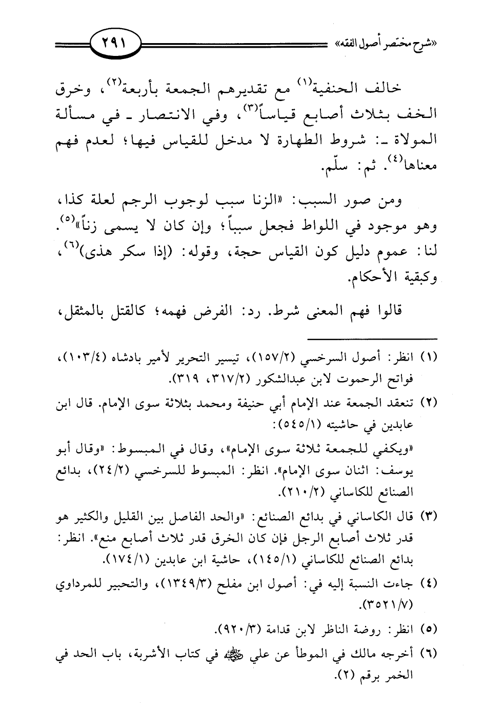 خالف الحنفية (¬1) مع تقديرهم الجمعة بأربعة (¬2)، وخرق الخف بثلاث أصابع قياسًا (¬3)، وفي الانتصار -في مسألة المولاة-: شروط الطهاوة لا مدخل للقياس فيها؛ لعدم فهم معناها (¬4). ثم: سلّم.