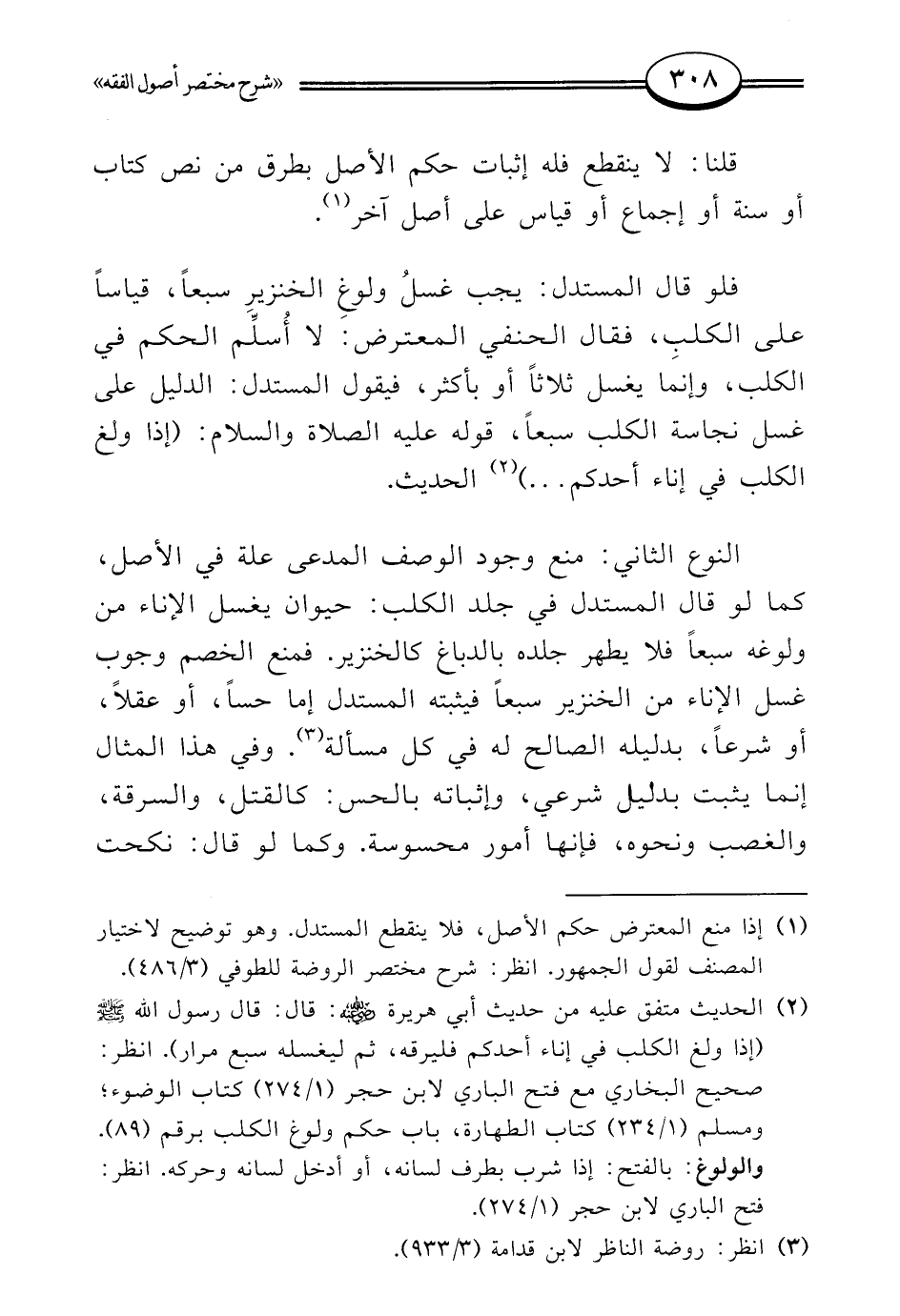 النوع الثاني: منع وجود الوصف المدعى علة في الأصل، كما لو قال المستدل في جلد الكلب: حيوان يغسل الإناء من ولوغه سبعًا فلا يطهر جلده بالدباغ كالخنزير. فمنع الخصم وجوب غسل الإناء من الخنزير سبعًا فيثبته المستدل إما حسًا، أو عقلًا، أو شرعًا، بدليله الصالح له في كل مسألة (¬3). وفي هذا المثال إنما يثبت بدليل شرعي، وإثباته بالحس: كالقتل، والسرقة، والغصب ونحوه، فإنها أمور محسوسة. وكما لو قال: نكحت