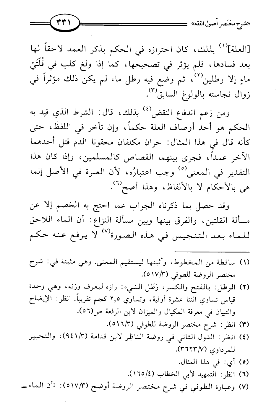 (¬7) وعبارة الطوفي في شرح مختصر الروضة أوضح (3/ 517): "أن الماء =