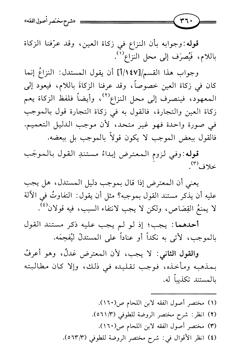 والقول الثاني: لا يجب، لأن المعترض عَدلٌ، وهو أعرفُ بمذهبه ومأخذه، فوجب تقليده في ذلك، وإلا كان مطالبته بالمستند تكذيبًا له.