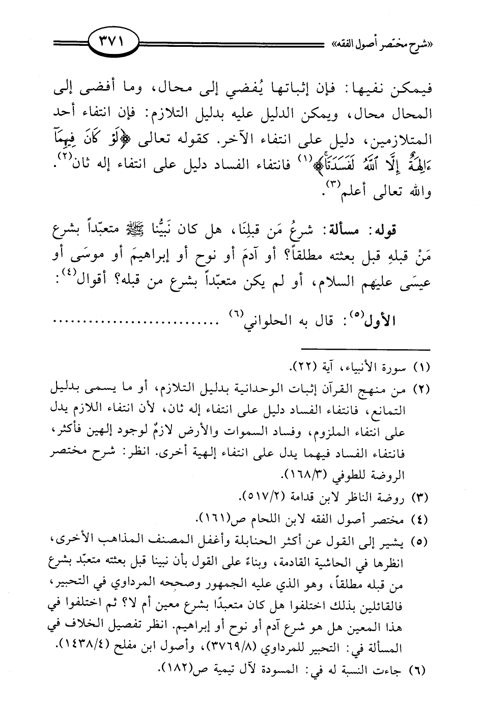 (¬5) يشير إلى القول عن أكثر الحنابلة وأغفل المصنف المذاهب الأخرى، انظرها في الحاشية القادمة، وبناءً على القول بأن نبينا قبل بعثته متعبّد بشرع من قبله مطلقًا، وهو الذي عليه الجمهور وصححه المرداوي في التحبير، فالقائلين بذلك اختلفوا هل كان متعبدًا بشرع معين أم لا؟ ثم اختلفوا في هذا المعين هل هو شرع آدم أو نوح أو إبراهيم. انظر تفصيل الخلاف في المسألة في: التحبير للمرداوي (8/ 3769)، وأصول ابن مفلح (4/ 1438).