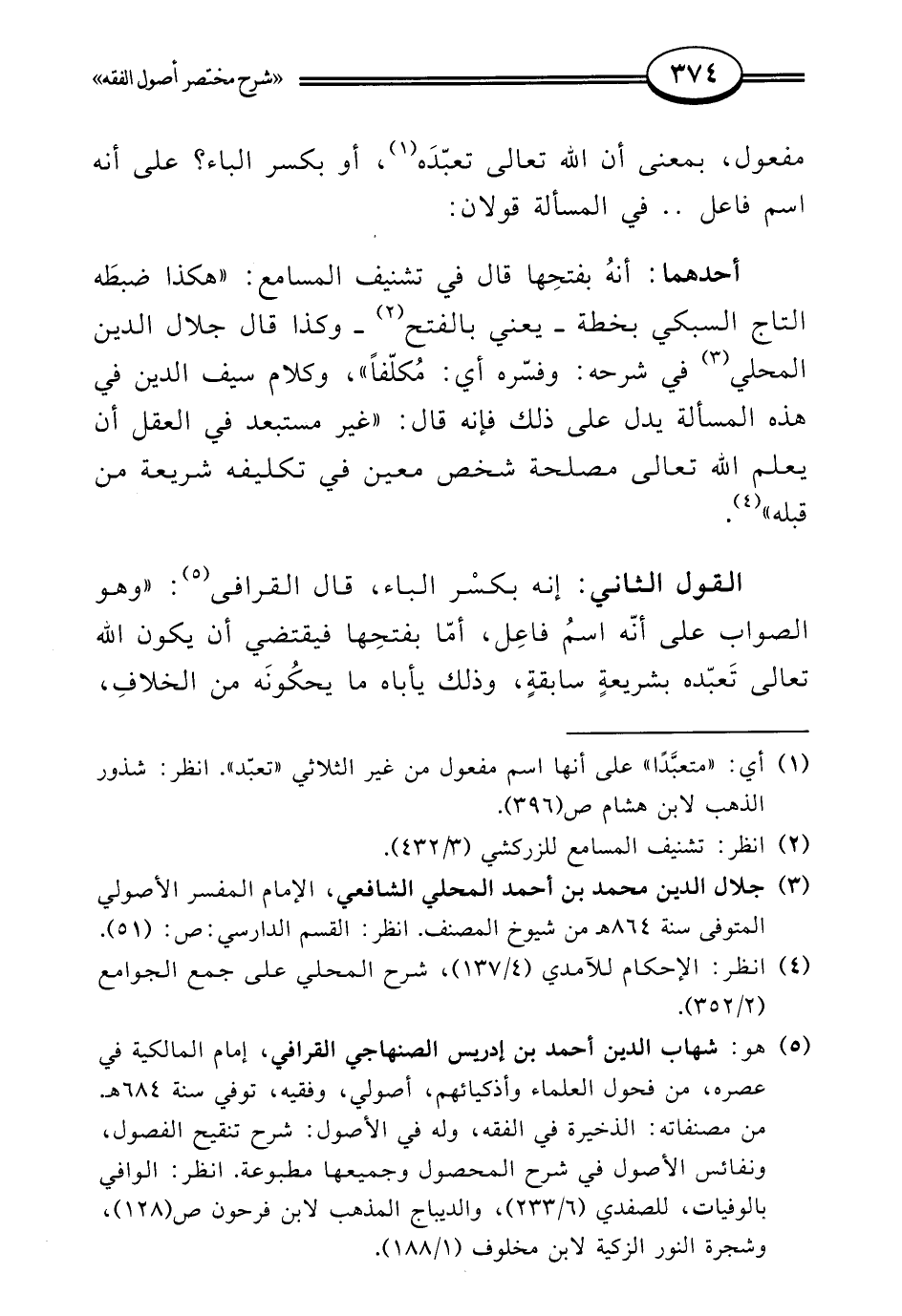 القول الثاني: إنه بكسْر الباء، قال القرافي (¬5): "وهو الصواب على أنّه اسمُ فاعِل، أمّا بفتحِها فيقتضي أن يكون الله تعالى تَعبّده بشريعةٍ سابقةٍ، وذلك يأباه ما يحكُونَه من الخلافِ،