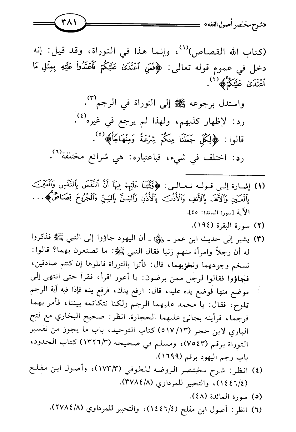 (¬1) إشارة إلى قوله تعالى: {وَكَتَبْنَا عَلَيْهِمْ فِيهَا أَنَّ النَّفْسَ بِالنَّفْسِ وَالْعَيْنَ بِالْعَيْنِ وَالْأَنْفَ بِالْأَنْفِ وَالْأُذُنَ بِالْأُذُنِ وَالسِّنَّ بِالسِّنِّ وَالْجُرُوحَ قِصَاصٌ} ... الآية [سورة المائدة: 45].
