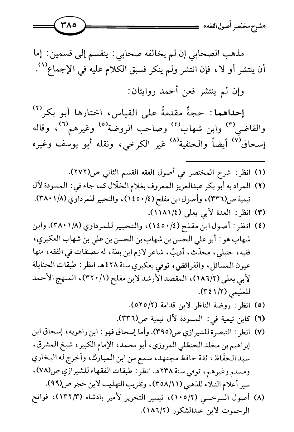 (¬4) انظر: أصول ابن مفلح (4/ 1450)، والتحبير للمرداوي (8/ 3801). وابن شهاب هو: أبو علي الحسن بن شهاب بن الحسن بن علي بن شهاب العكبري، فقيه، حنبلي، محدّث، أديبٌ، شاعر لازم ابن بطة، له مصنفات في الفقه، منها عيون المسائل، والفرائض، توفي بعكبري سنة 428 هـ. انظر: طبقات الحنابلة لأبي يعلى (2/ 186)، المقصد الأرشد لابن مفلح (1/ 320)، المنهج الأحمد للعليمي (2/ 341).