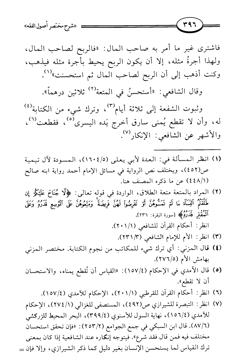 وثبوت الشفعة إلى ثلاثة أيام (¬3)، وترك شيء من الكتابة (¬4) له، وأن لا تقطع يُمنى سارق أخرج يَده اليسرى (¬5)، فقطعت (¬6)، والأشهر عن الشافعي: الإنكار (¬7).