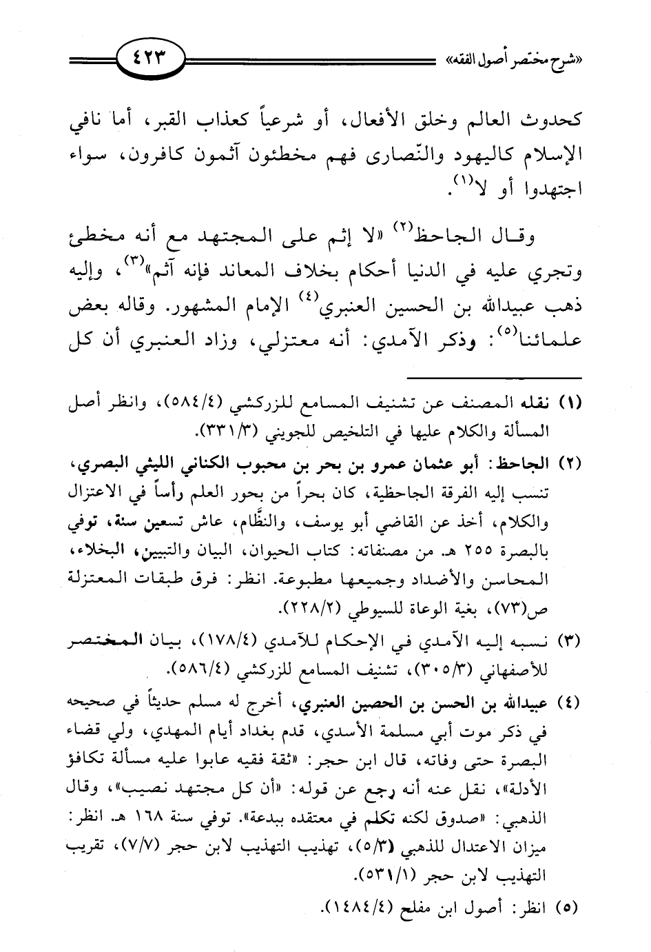وقال الجاحظ (¬2) "لا إثم على المجتهد مع أنه مخطئ وتجري عليه في الدنيا أحكام بخلاف المعاند فإنه آثم" (¬3)، وإليه ذهب عبيد الله بن الحسين العنبري (¬4) الإمام المشهور. وقاله بعض علمائنا (¬5): وذكر الآمدي. أنه معتزلي، وزاد العنبري أن كل
