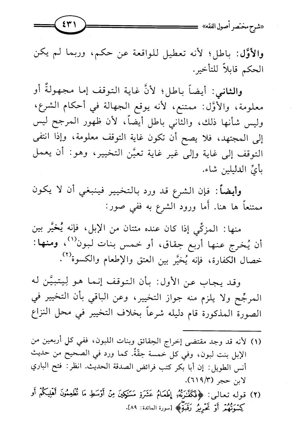 والثاني: أيضًا باطل؛ لأنَّ غاية التوقف إما مجهولةٌ أو معلومة، والأوَّل: ممتنع، لأنه يوقع الجهالة في أحكام الشرع، وليس شأنها ذلك، والثاني باطل أيضًا، لأن ظهور المرجح ليس إلى المجتهد، فلا يصح أن تكون غاية التوقف معلومة، وإذا انتفى التوقف إلى غاية وإلى غير غاية تعيَّن التخيير، وهو: أن يعمل بأيِّ الدليلين شاء.