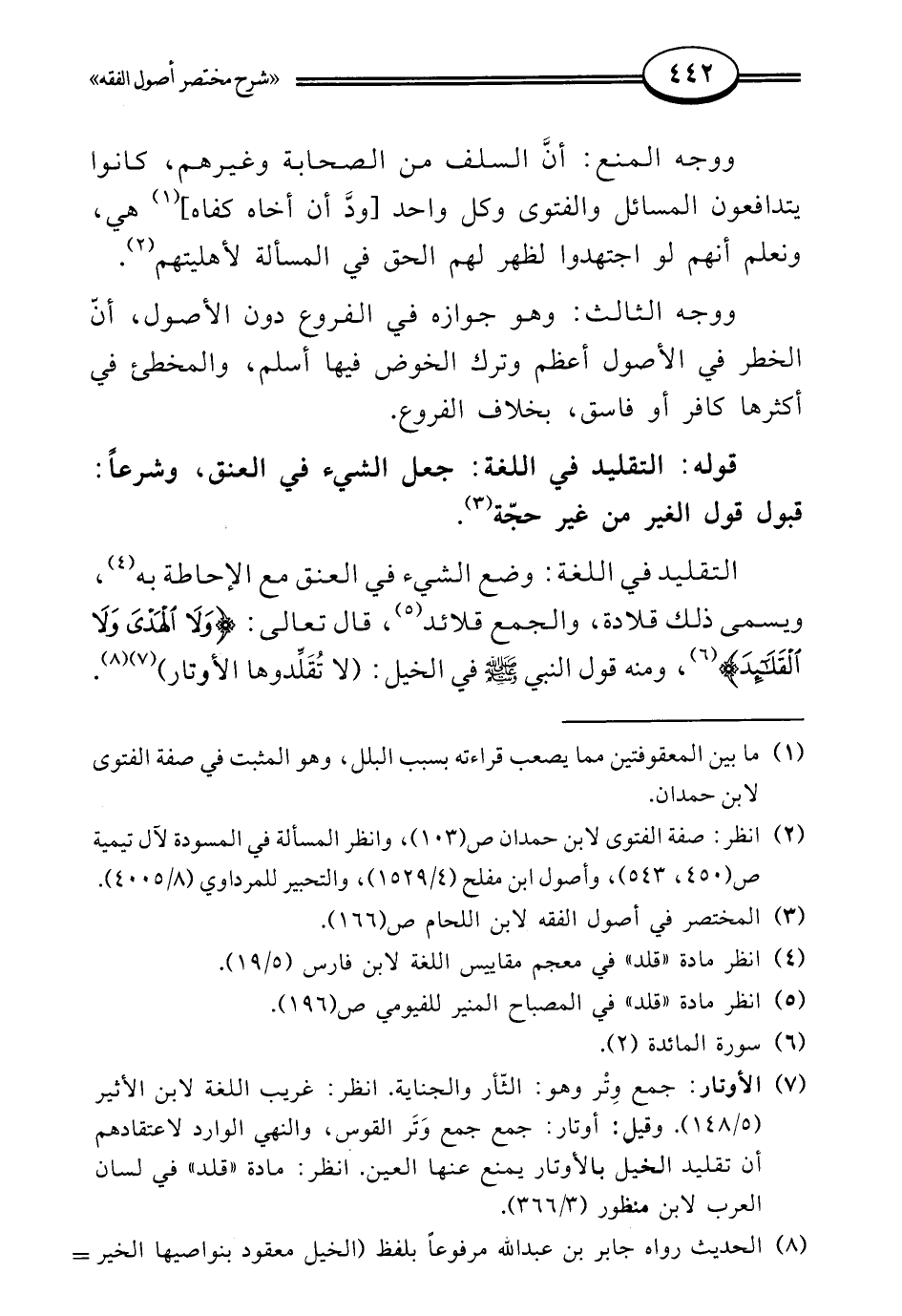 (¬2) انظر: صفة الفتوى لابن حمدان ص (103)، وانظر المسألة في المسودة لآل تيمية ص (450، 543)، وأصول ابن مفلح (4/ 1529)، والتحبير للمرداوي (8/ 4005).