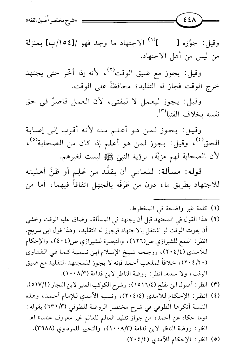 (¬4) انظر: الإحكام للآمدي (4/ 204)، ونسبه الآمدي للإمام أحمد، وهذه النسبة أنكرها الطوفي في شرح مختصر الروضة للطوفي (3/ 63) بقوله: "وما حكاه عن أحمد، من جواز تقليد العالم للعالم غير معروف عندنا" اهـ.