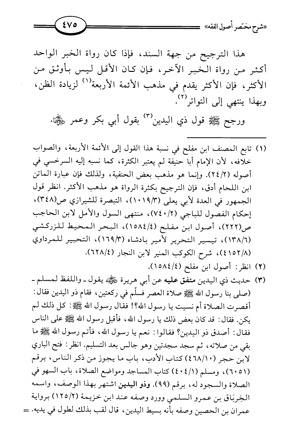 (¬1) تابع المصنف ابن مفلح في نسبة هذا القول إلى الأئمة الأربعة، والصواب خلافه، لأن الإمام أبا حنيفة لم يعتبر الكثرة، كما نسبه إليه السرخسي في أصوله (2/ 24). وإنما هو مذهب بعض الحنفية، ولذلك فإن عبارة الماتن ابن اللحام أدق، فإن الترجيح بكثرة الرواة هو مذهب الأكثر. انظر قول الجمهور في العدة لأبي يعلى (3/ 1019)، التبصرة للشيرازي ص (348)، إحكام الفصول للباجي (2/ 740)، منتهى السول والأمل لابن الحاجب ص (222)، أصول ابن مفلح (4/ 1584)، البحر المحيط للزركشي (6/ 138)، تيسير التحرير لأمير بادشاه (3/ 169)، التحبير للمرداوي (8/ 4152)، شرح الكوكب المنير لابن النجار (4/ 628).