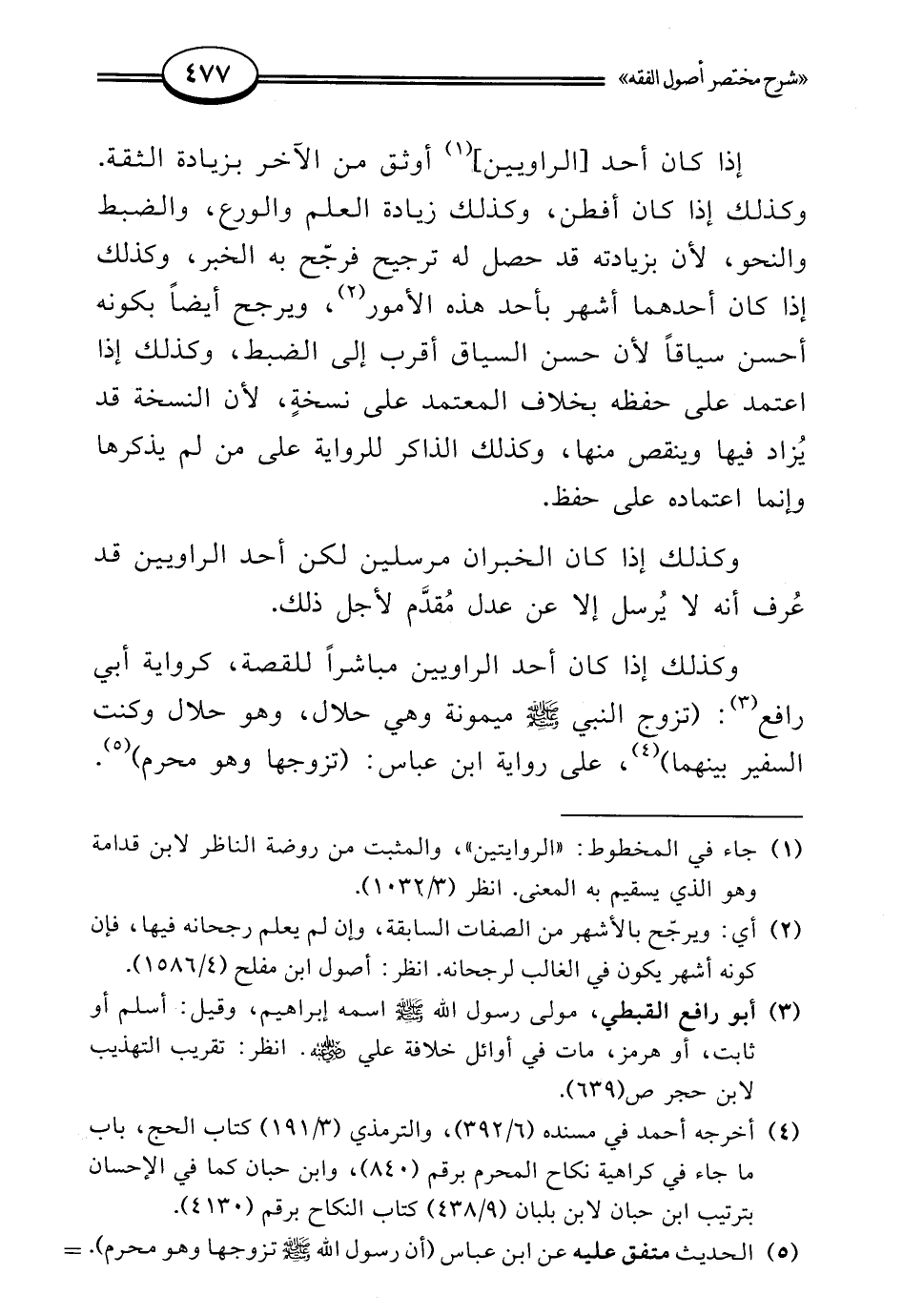 إذا كان أحد [الراويين] (¬1) أوثق من الآخر بزيادة الثقة. وكذلك إذا كان أفطن، وكذلك زيادة العلم والورع، والضبط والنحو، لأن بزيادته قد حصل له ترجيح فرجّح به الخبر، وكذلك إذا كان أحدهما أشهر بأحد هذه الأمور (¬2)، ويرجح أيضًا بكونه أحسن سياقًا لأن حسن السياوا أقرب إلى الضبط، وكذلك إذا اعتمد على حفظه بخلاف المعتمد على نسخةٍ، لأن النسخة قد يُزاد فيها وينقص منها، وكذلك الذاكر للرواية على من لم يذكرها وإنما اعتماده على حفظ.