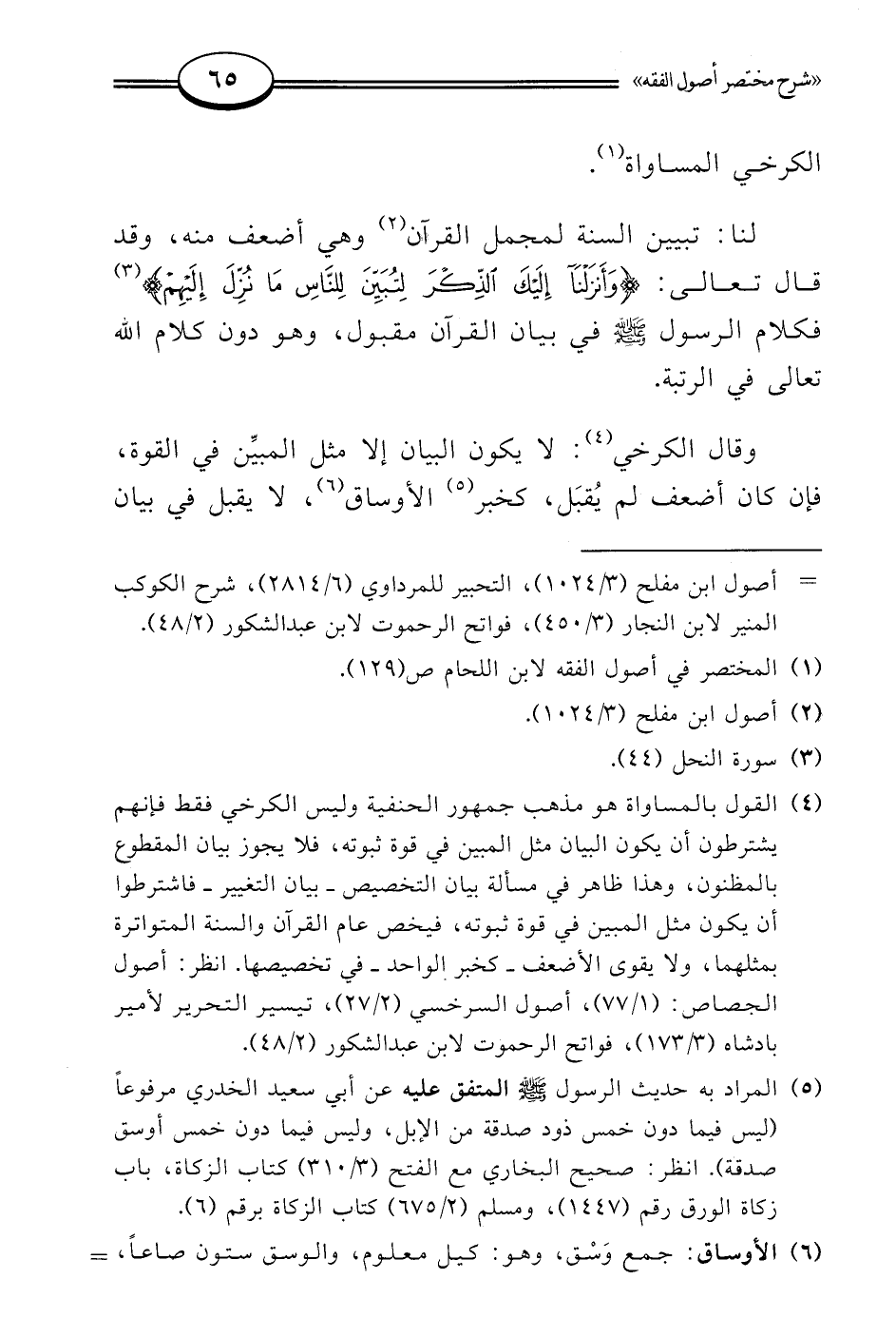 (¬4) القول بالمساواة هو مذهب جمهور الحنفية وليس الكرخي فقط فإنهم يشترطون أن يكون البيان مثل المبين في قوة ثبوته، فلا يجوز بيان المقطوع بالمظنون، وهذا ظاهر في مسألة بيان التخصيص - بيان التغيير - فاشترطوا أن يكون مثل المبين في قوة ثبوته، فيخص عام القرآن والسنة المتواترة بمثلهما, ولا يقوى الأضعف - كخبر الواحد - في تخصيصها. انظر: أصول الجصاص: (1/ 77)، أصول السرخسي (2/ 27)، تيسير التحرير لأمير بادشاه (3/ 173)، فواتح الرحموت لابن عبد الشكور (2/ 48).