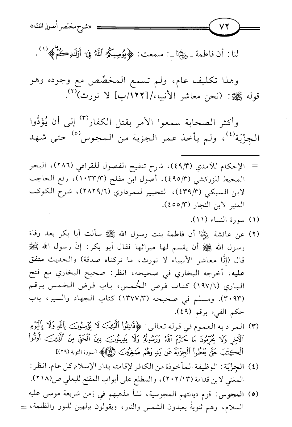 وهذا تكليف عام، ولم تسمع المخصِّص مع وجوده وهو قوله - صلى الله عليه وسلم -: (نحن معاشر الأنبياء لا نورث) (¬2).