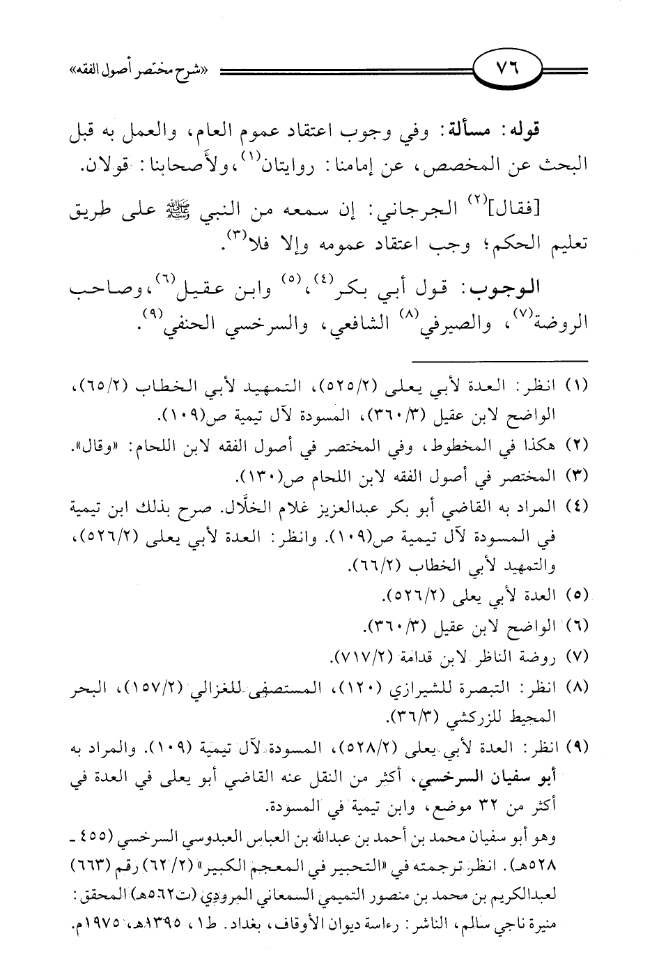 (¬9) انظر: العدة لأبي يعلى (2/ 528)، المسودة لآل تيمية (109). والمراد به أبو سفيان السرخسي، أكثر من النقل عنه القاضي أبو يعلى في العدة في أكثر من 32 موضع، وابن تيمية في المسودة.