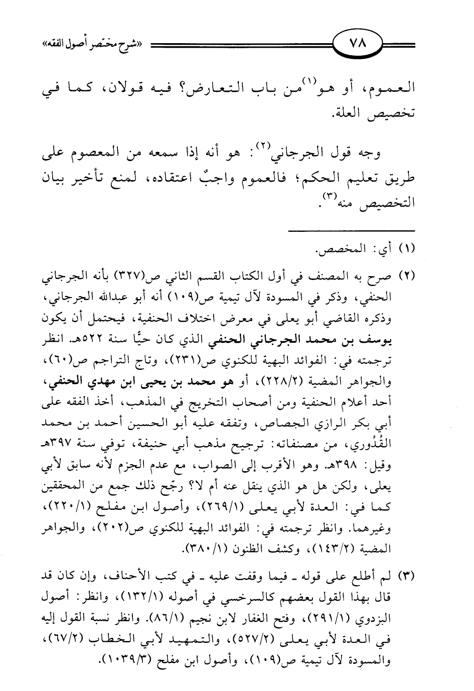 (¬2) صرح به المصنف في أول الكتاب القسم الثاني ص (327) بأنه الجرجاني الحنفي، وذكر في المسودة لآل تيمية ص (109) أنه أبو عبد الله الجرجاني، وذكره القاضي أبو يعلى في معرض اختلاف الحنفية، فيحتمل أن يكون يوسف بن محمد الجرجاني الحنفي الذي كان حيًّا سنة 522 هـ. انظر ترجمته في: الفوائد البهية للكنوي ص (231)، وتاج التراجم ص (60)، والجواهر المضية (2/ 228)، أو هو محمد بن يحيى بن مهدي الحنفي، أحد أعلام الحنفية ومن أصحاب التخريج في المذهب، أخذ الفقه على أبي بكر الرازي الجصاص، وتفقه عليه أبو الحسين أحمد بن محمد القُدُوري، من مصنفاته: ترجيح مذهب أبي حنيفة، توفي سنة 397 هـ وقيل: 398 هـ. وهو الأقرب إلى الصواب، مع عدم الجزم لأنه سابق لأبي يعلى، ولكن هل هو الذي ينقل عنه أم لا؟ رجّح ذلك جمع من المحققين كما في: العدة لأبي يعلى (1/ 269)، وأصول ابن مفلح (1/ 220)، وغيرهما. وانظر ترجمته في: الفوائد البهية للكنوي ص (202)، والجواهر المضية (2/ 143)، وكشف الظنون (1/ 380).