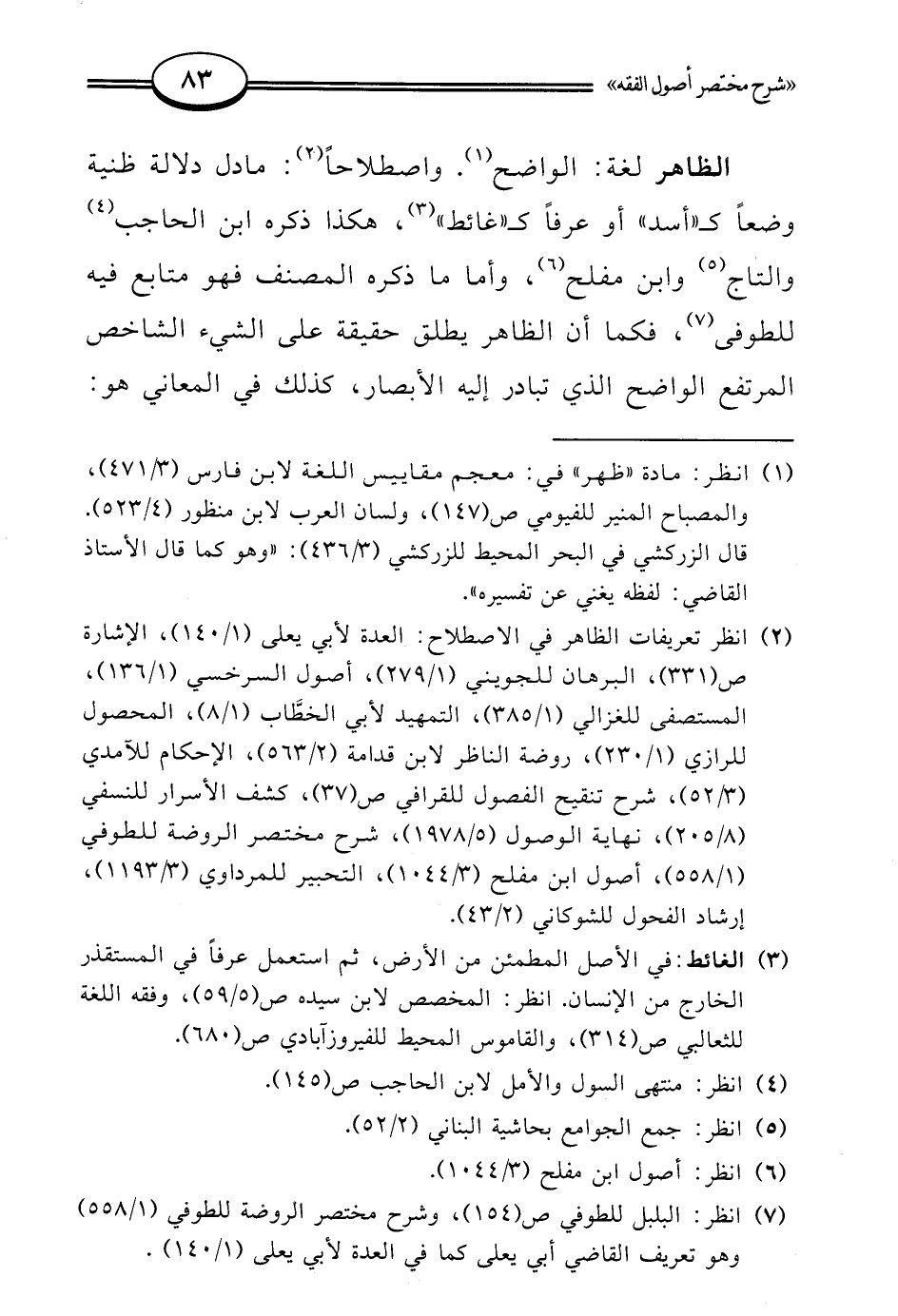 (¬2) انظر تعريفات الظاهر في الاصطلاح: العدة لأبي يعلى (1/ 140)، الإشارة ص (331)، البرهان للجويني (1/ 279)، أصول السرخسي (1/ 136)، المستصفى للغزالي (1/ 385)، التمهيد لأبي الخطَّاب (1/ 8)، المحصول للرازي (1/ 230)، روضة الناظر لابن قدامة (2/ 563)، الإحكام للآمدي (3/ 52)، شرح تنقيح الفصول للقرافي ص (37)، كشف الأسرار للنسفي (8/ 205)، نهاية الوصول (5/ 1978)، شرح مختصر الروضة للطوفي (1/ 558)، أصول ابن مفلح (3/ 1044)، التحبير للمرداوي (3/ 1193)، إرشاد الفحول للشوكاني (2/ 43).