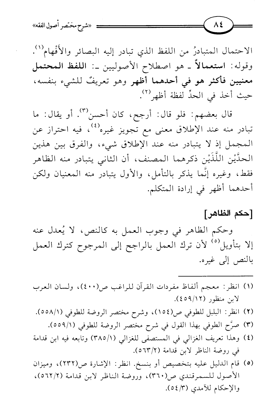 وحكم الظاهر في وجوب العمل به كالنص، لا يُعدل عنه إلا بتأويل (¬5) لأن ترك العمل بالراجح إلى المرجوح كترك العمل بالنص إلى غيره.