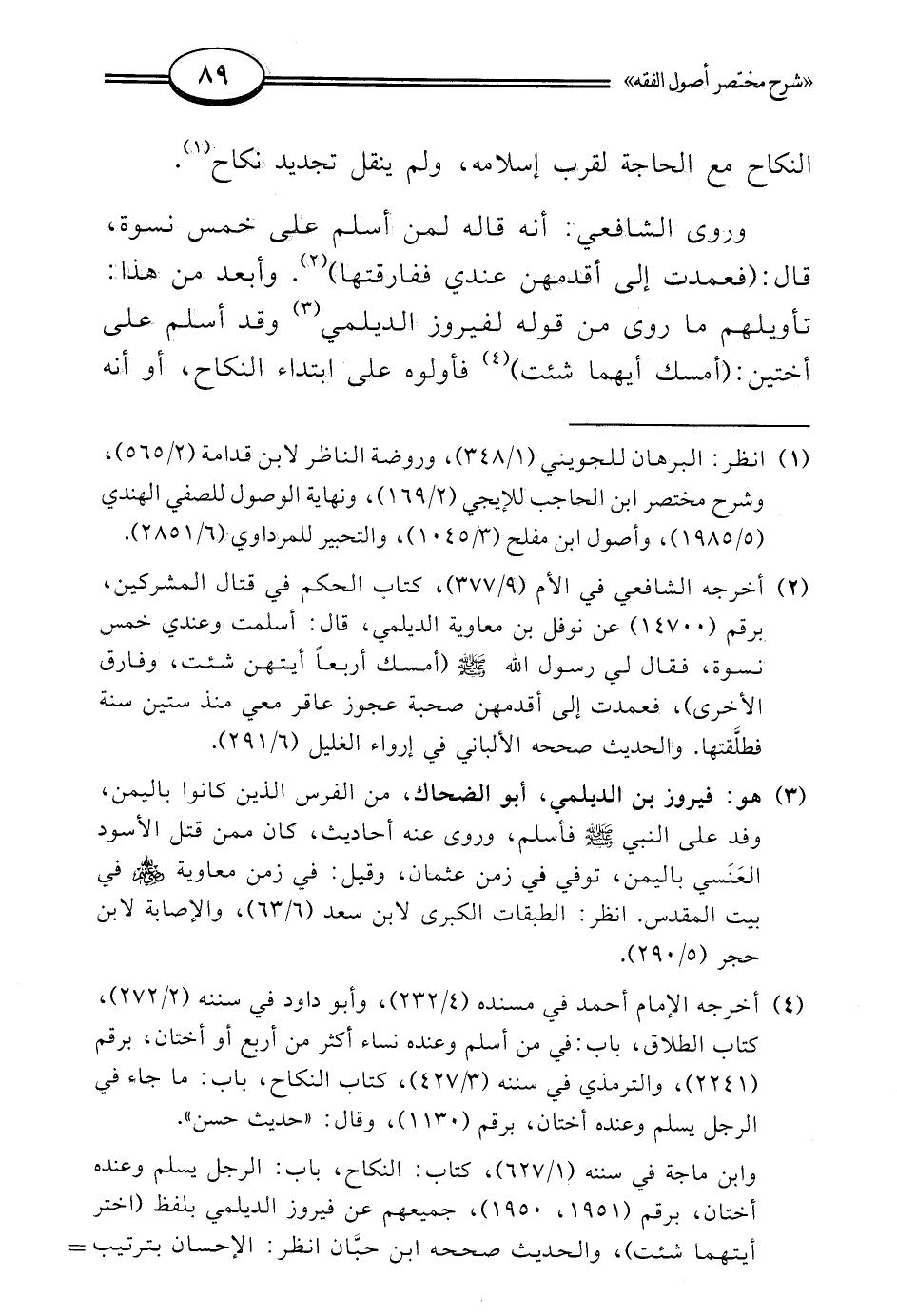 (¬2) أخرجه الشافعي في الأم (9/ 377)، كتاب الحكم في قتال المشركين، برقم (14700) عن نوفل بن معاوية الديلمي، قال: أسلمت وعندي خمس نسوة، فقال لي رسول الله - صلى الله عليه وسلم - (أمسك أربعًا أيتهن شئت، وفارق الأخرى)، فعمدت إلى أقدمهن صحبة عجوز عاقر معي منذ ستين سنة فطلَّقتها. والحديث صححه الألباني في إرواء الغليل (6/ 291).