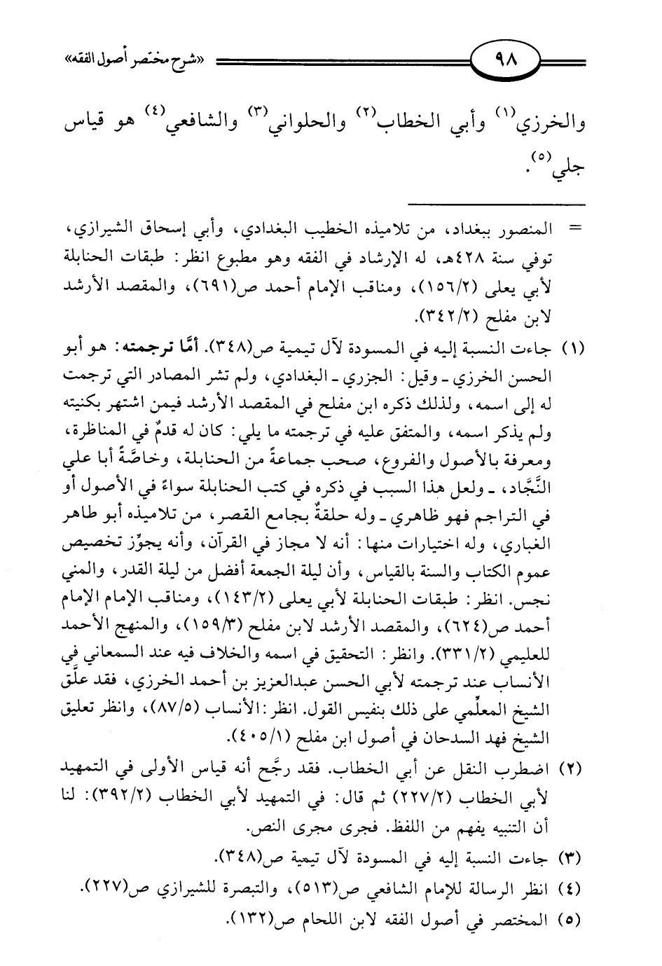 (¬1) جاءت النسبة إليه في المسودة لآل تيمية ص (348). أمَّا ترجمته: هو أبو الحسن الخرزي - وقيل: الجزري - البغدادي، ولم تشر المصادر التي ترجمت له إلى اسمه، ولذلك ذكره ابن مفلح في المقصد الأرشد فيمن اشتهر بكنيته ولم يذكر اسمه، والمتفق عليه في ترجمته ما يلي: كان له قدمٌ في المناظرة، ومعرفة بالأصول والفروع، صحب جماعةً من الحنابلة، وخاصَّةً أبا علي النَّجَّاد، - ولعل هذا السبب في ذكره في كتب الحنابلة سواءً في الأصول أو في التراجم فهو ظاهري - وله حلقةٌ بجامع القصر، من تلاميذه أبو طاهر الغباري، وله اختيارات منها: أنه لا مجاز في القرآن، وأنه يجوِّز تخصيص عموم الكتاب والسنة بالقياس، وأن ليلة الجمعة أفضل من ليلة القدر، والمني نجس. انظر: طبقات الحنابلة لأبي يعلى (2/ 143)، ومناقب الإمام الإمام أحمد ص (624)، والمقصد الأرشد لابن مفلح (3/ 159)، والمنهج الأحمد للعليمي (2/ 331). وانظر: التحقيق في اسمه والخلاف فيه عند السمعاني في الأنساب عند ترجمته لأبي الحسن عبد العزيز بن أحمد الخرزي، فقد علَّق الشيخ المعلِّمي على ذلك بنفيس القول. انظر: الأنساب (5/ 87)، وانظر تعليق الشيخ فهد السدحان في أصول ابن مفلح (1/ 405).