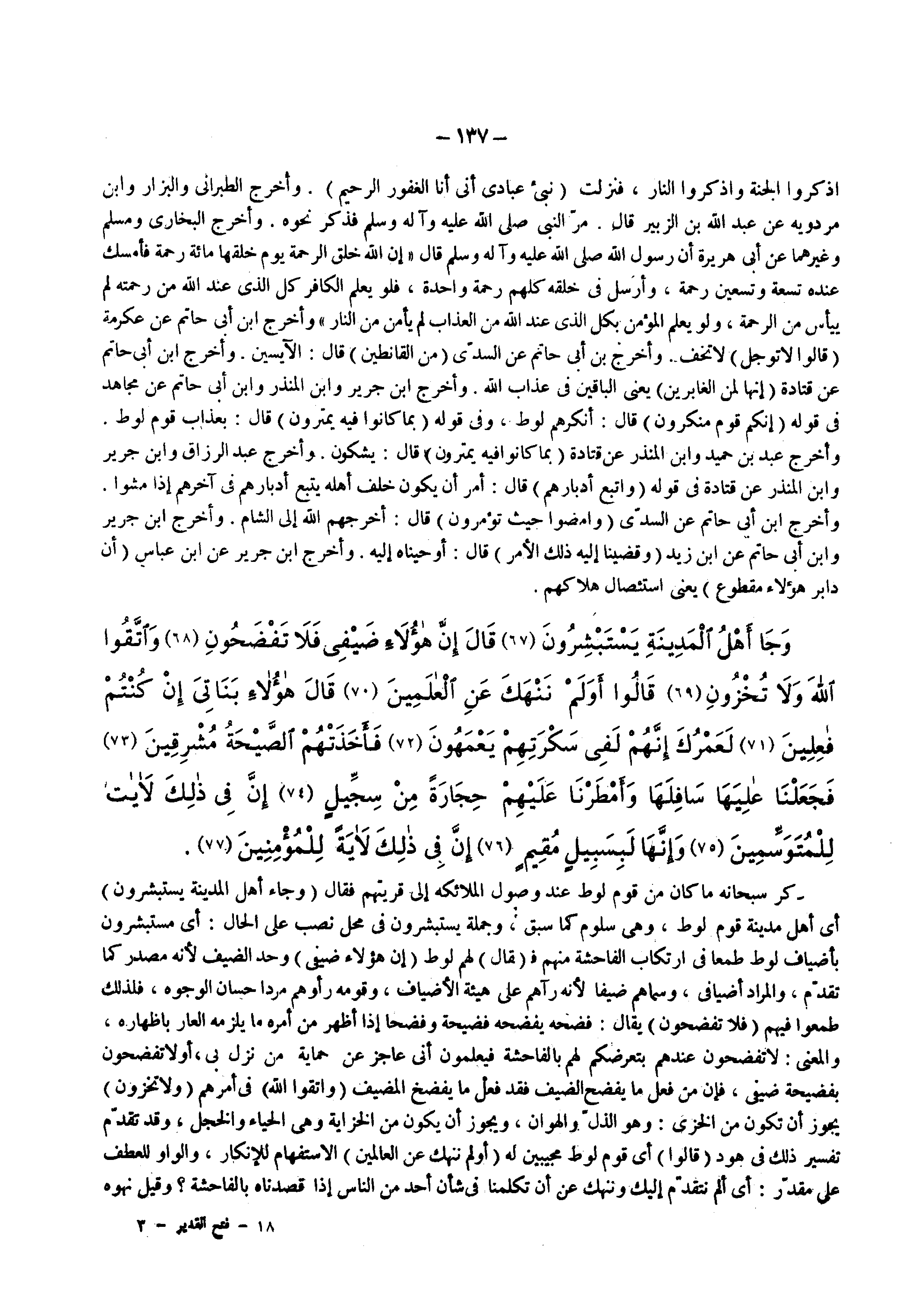 اذكروا الجنة واذكروا النار فنزلت ) نبئ عبادي أني أنا الغفور الرحيم ( وأخرج الطبراني والبزار وابن مردويه عن عبد الله بن الزبير قال مر النبي ( صلى الله عليه وسلم ) فذكر نحوه وأخرج البخاري ومسلم وغيرهما عن أبي هريرة أن رسول الله ( صلى الله عليه وسلم ) قال إن الله خلق الرحمة يوم خلقها مائة رحمة فأمسك عنده تسعة وتسعين رحمة وارسل فى خلقه كلهم رحمة واحدة فلو يعلم الكافر كل الذى عند الله من رحمته لم ييأس من الرحمة ولو يعلم المؤمن بكل الذى عند الله من العذاب لم يأمن من النار وأخرج ابن أبي حاتم عن عكرمة ) قالوا لا توجل ( لا تخف وأخرج بن أبي حاتم عن السدي ) من القانطين ( قال الآيسين وأخرج ابن أبي حاتم عن قتادة ) إنها لمن الغابرين ( يعني الباقين فى عذاب الله وأخرج ابن جرير وابن المنذر وابن أبي حاتم عن مجاهد فى قوله ) إنكم قوم منكرون ( قال أنكرهم لوط وفى قوله ) بما كانوا فيه يمترون ( قال بعذاب قوم لوط وأخرج عبد بن حميد وابن المنذر عن قتادة ) بما كانوا فيه يمترون ( قال يشكون وأخرج عبد الرزاق وابن جرير وابن المنذر عن قتادة فى قوله ) واتبع أدبارهم ( قال أمر أن يكون خلف أهله يتبع أدبارهم فى آخرهم إذا مشوا وأخرج ابن أبي حاتم عن السدي ) وامضوا حيث تؤمرون ( قال أخرجهم الله إلى الشام وأخرج ابن جرير وابن أبي حاتم عن ابن زيد ) وقضينا إليه ذلك الأمر ( قال أوحيناه إليه وأخرج ابن جرير عن ابن عباس ) أن دابر هؤلاء مقطوع ( يعنى استئصال هلاكهم