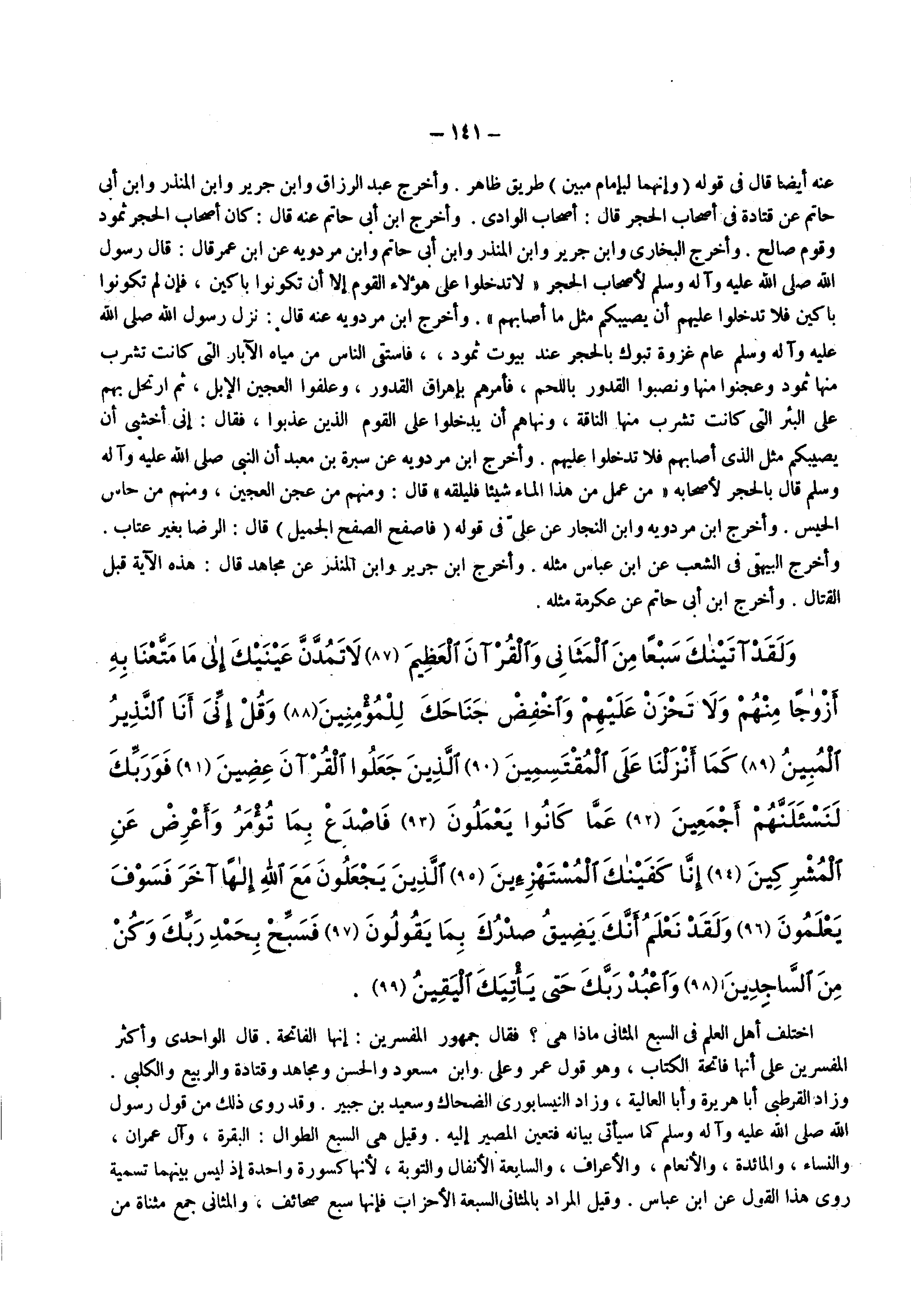 عنه أيضا فى قوله ) وإنهما لبإمام مبين ( طريق ظاهر وأخرج عبد الرزاق وابن جرير وابن المنذر وابن أبى حاتم عن قتادة فى أصحاب الحجر قال أصحاب الوادى وأخرج ابن أبى حاتم عنه قال كان أصحاب الحجر ثمود وقوم صالح وأخرج البخارى وابن جرير وابن المنذر وابن أبى حاتم وابن مردويه عن ابن عمر قال قال رسول الله ( صلى الله عليه وسلم ) لأصحاب الحجر لا تدخلوا على هؤلاء القوم إلا أن تكونوا باكين فإن لم تكونوا باكين فلا تدخلوا عليهم أن يصيبكم مثل ما أصابهم وأخرج ابن مردويه عنه قال نزل رسول الله ( صلى الله عليه وسلم ) عام غزوة تبوك بالحجر عند بيوت ثمود فاستقى الناس من مياه الآبار التى كانت تشرب منها ثمود وعجنوا منها ونصبوا القدور باللحم فأمره بإهراق القدور وعلفوا العجين الإبل ثم ارتحل بهم على البئر التى كانت تشرب منها الناقة ونهاهم أن يدخلوا على القوم الذين عذبوا فقال إنى أخشى أن يصيبكم مثل الذى أصابهم فلا تدخلوا عليهم وأخرج ابن مردويه عن سبرة بن معبد أن النبى ( صلى الله عليه وسلم ) قال بالحجر لأصحابه من عمل من هذا الماء شيئا فليلقه قال ومنهم من عجن العجين ومنهم من حاس الحيس وأخرج ابن مردويه وابن النجار عن علي فى قوله ) فاصفح الصفح الجميل ( قال الرضا بغير عتاب وأخرج البيهقى فى الشعب عن ابن عباس مثله وأخرج ابن جرير وابن المنذر عن مجاهد قال هذه الآية قبل القتال وأخرج ابن أبى حاتم عن عكرمة مثله