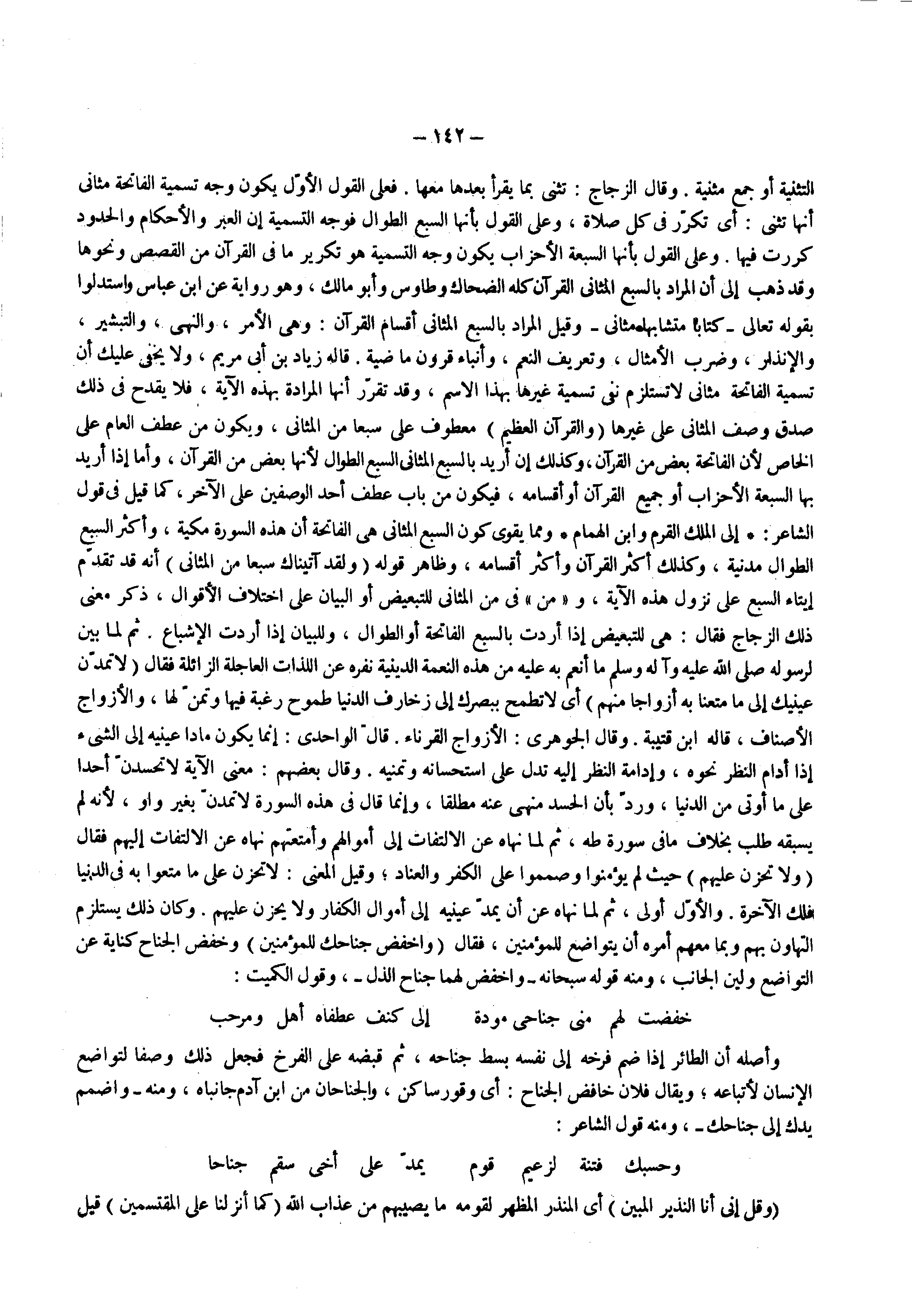 ومما يقوى كون السبع المثانى هى الفاتحة أن هذه السورة مكية وأكثر السبع الطوال مدنية وكذلك أكثر القرآن وأكثر أقسامه وظاهر قوله ) ولقد آتيناك سبعا من المثاني ( أنه قد تقدم إيتاء السبع على نزول هذه الآية و ) من ( فى من المثانى للتبعيض أو البيان على اختلاف الأقوال ذكر معنى ذلك الزجاج فقال هى للتبعيض إذا أردت بالسبع الفاتحة أو الطوال وللبيان إذا أردت الإشباع
