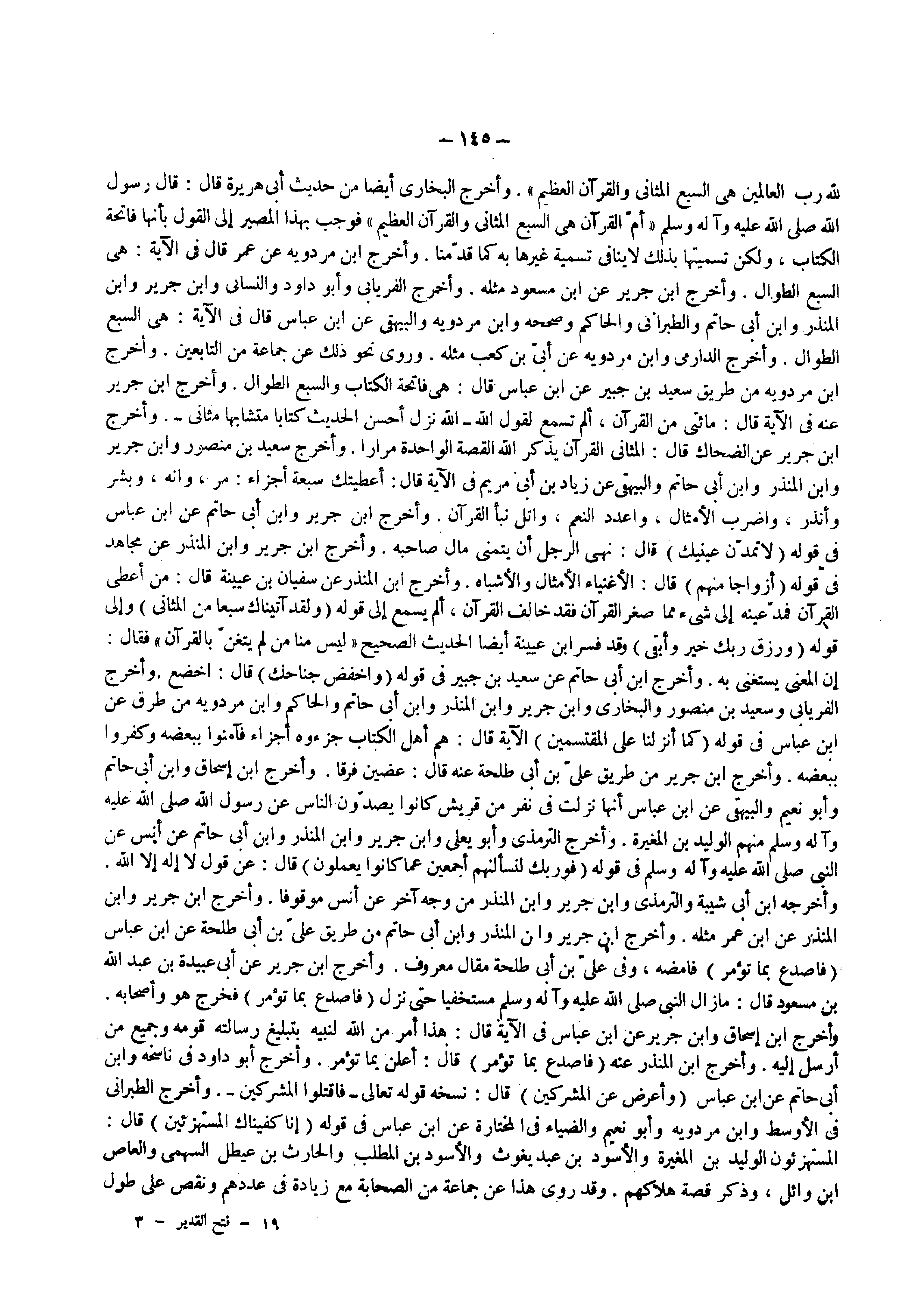 لله رب العالمين هى السبع المثانى والقرآن العظيم وأخرج البخارى أيضا من حديث أبى هريرة قال قال رسول اله ( صلى الله عليه وسلم ) أم القرآن هى السبع المثانى والقرآن العظيم فوجب بهذا المصير إلى القول بأنها فاتحة الكتاب ولكن تسميتها بذلك لا ينافى تسمية غيرها به كما قدمنا وأخرج ابن مردويه عن عمر قال فى الآية هى السبع الطوال وأخرج ابن جرير عن ابن مسعود مثله وأخرج الفريابى وأبو داود والنسائى وابن جرير وابن المنذر وابن أبى حاتم والطبرانى والحاكم وصححه وابن مردويه والبيهقى عن ابن عباس قال فى الآية هى السبع الطوال وأخرج الدارمى وابن مردويه عن أبى بن كعب مثله وروى نحو ذلك عن جماعة من التابعين وأخرج ابن مردويه من طريق سعيد بن جبير عن ابن عباس قال هى فاتحة الكتاب والسبع الطوال وأخرج ابن جرير عنه فى الآية قال مائتى من القرآن ألم تسمع لقول الله ) الله نزل أحسن الحديث كتابا متشابها مثاني ( وأخرج ابن جرير عن الضحاك قال المثانى القرآن يذكر الله القصة الواحدة مرارا وأخرج سعيد بن منصور وابن جرير وابن المنذر وابن أبي حاتم والبيهقى عن زياد بن أبى مريم فى الآية قال أعطيتك سبعة أجزاء مر وانه وبشر وأنذر واضرب الأمثال واعدد النعم واتل نبأ القرآن وأخرج ابن جرير وابن أبى حاتم عن ابن عباس فى قوله ) لا تمدن عينيك ( قال نهى الرجل أن يتمنى مال صاحبه وأخرج ابن جرير وابن المنذر عن مجاهد فى قوله ) أزواجا منهم ( قال الأغنياء الأمثال والأشباه وأخرج ابن المنذر عن سفيان بن عيينة قال من أعطى القرآن فمد عينه إلى شيء مما صغر القرآن فقد خالف القرآن ألم يسمع إلى قوله ) ولقد آتيناك سبعا من المثاني ( وإلى قوله ) ورزق ربك خير وأبقى ( وقد فسر ابن عيينة أيضا الحديث الصحيح ليس منا من لم يتغن بالقرآن فقال إن المعنى يستغنى به وأخرج ابن أبى حاتم عن سعيد بن جبير فى قوله ) واخفض جناحك ( قال اخضع وأخرج الفريابى وسعيد بن منصور والبخارى وابن جرير وابن المنذر وابن أبى حاتم والحاكم وابن مردويه من طرق عن ابن عباس فى قوله ) كما أنزلنا على المقتسمين ( الآية قال هم أهل الكتاب جزءوه أجزاء فآمنوا ببعضه وكفروا ببعضه وأخرج ابن جرير من طريق علي بن أبى طلحة عنه قال عضين فرقا وأخرج ابن إسحاق وابن أبى حاتم وأبو نعيم والبيهقى عن ابن عباس أنها نزلت فى نفر من قريش كانوا يصدون الناس عن رسول الله ( صلى الله عليه وسلم ) منهم الوليد بن المغيرة وأخرج الترمذى وأبو يعلى وابن جرير وابن المنذر وابن أبى حاتم عن أنس عن النبى ( صلى الله عليه وسلم ) فى قوله ) فوربك لنسألنهم أجمعين عما كانوا يعملون ( قال عن قول لا إله إلا الله وأخرجه ابن أبى شيبة والترمذى وابن جرير وابن المنذر من وجه آخر عن أنس موقوفا وأخرج ابن جرير وابن المنذر عن ابن عمر مثله وأخرج ابن جرير وابن المنذر وابن أبى حاتم من طريق علي بن أبى طلحة عن ابن عباس ) فاصدع بما تؤمر ( فامضه وفى على بن أبى طلحة مقال معروف وأخرج ابن جرير عن أبى عبيدة بن عبد الله بن مسعود قال ما زال النبى ( صلى الله عليه وسلم ) مستخفيا حتى نزل ) فاصدع بما تؤمر ( فخرج هو وأصحابه وأخرج ابن إسحاق وابن جرير عن ابن عباس فى الآية قال هذا أمر من الله لنبيه بتبليغ رسالته قومه وجميع من أرسل إليه وأخرج ابن المنذر عنه ) فاصدع بما تؤمر ( قال أعلن بما تؤمر وأخرج أبو داود فى ناسخه وابن أبى حاتم عن ابن عباس ) وأعرض عن المشركين ( قال نسخه قوله تعالى ) فاقتلوا المشركين ( وأخرج الطبرانى فى الأوسط وابن مردويه وأبو نعيم والضياء فى المختارة عن ابن عباس فى قوله ) إنا كفيناك المستهزئين ( قال المستهزئون الوليد بن المغيرة والأسود بن عبد يغوث والأسود بن المطلب والحارث بن عيطل السهمى والعاص ابن وائل وذكر قصة هلاكهم وقد روى هذا عن جماعة من الصحابة مع زيادة فى عددهم ونقص على طول