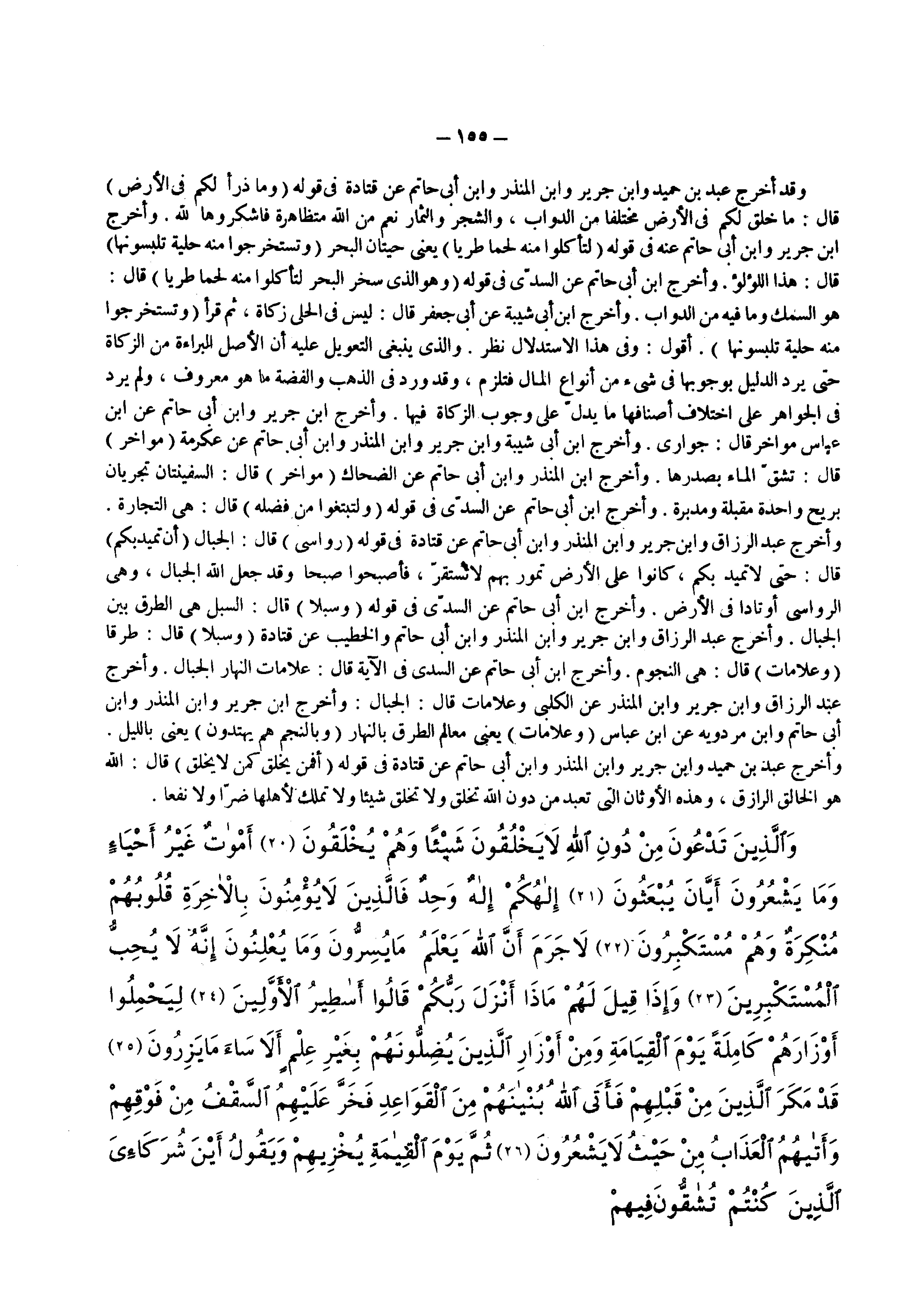وقد أخرج عبد بن حميد وابن جرير وابن المنذر وابن أبى حاتم عن قتادة فى قوله ) وما ذرأ لكم في الأرض ( قال ما خلق لكم فى الأرض مختلفا من الدواب والشجر والثمار نعم من الله متظاهرة فاشكروها لله وأخرج ابن جرير وابن أبى حاتم عنه فى قوله ) لتأكلوا منه لحما طريا ( يعنى حيتان البحر ) وتستخرجوا منه حلية تلبسونها ( قال هذا اللؤلؤ وأخرج ابن أبى حاتم عن السدى فى قوله ) وهو الذي سخر البحر لتأكلوا منه لحما طريا ( قال هو السمك وما فيه من الدواب وأخرج ابن أبى شيبة عن أبى جعفر قال ليس فى الحلى زكاة ثم قرأ ) وتستخرجوا منه حلية تلبسونها ( أقول وفى هذا الإستدلال نظر والذى ينبغى التعويل عليه أن الأصل البراءة من الزكاة حتى يرد الدليل بوجوبها فى شئ من أنواع المال فتلزم وقد ورد فى الذهب والفضة ما هو معروف ولم يرد فى الجواهر على اختلاف أصنافها ما يدل على وجوب الزكاة فيها وأخرج ابن جرير وابن أبى حاتم عن ابن عباس ) مواخر ( قال جوارى وأخرج ابن أبى شيبة وابن جرير وابن المنذر وابن أبى حاتم عن عكرمة ) مواخر ( قال تشق الماء بصدرها وأخرج ابن المنذر وابن أبى حاتم عن الضحاك ) مواخر ( قال السفينتان تجريان بريح واحدة مقبلة ومدبرة وأخرج ابن أبى حاتم عن السدى فى قوله ) ولتبتغوا من فضله ( قال هى التجارة