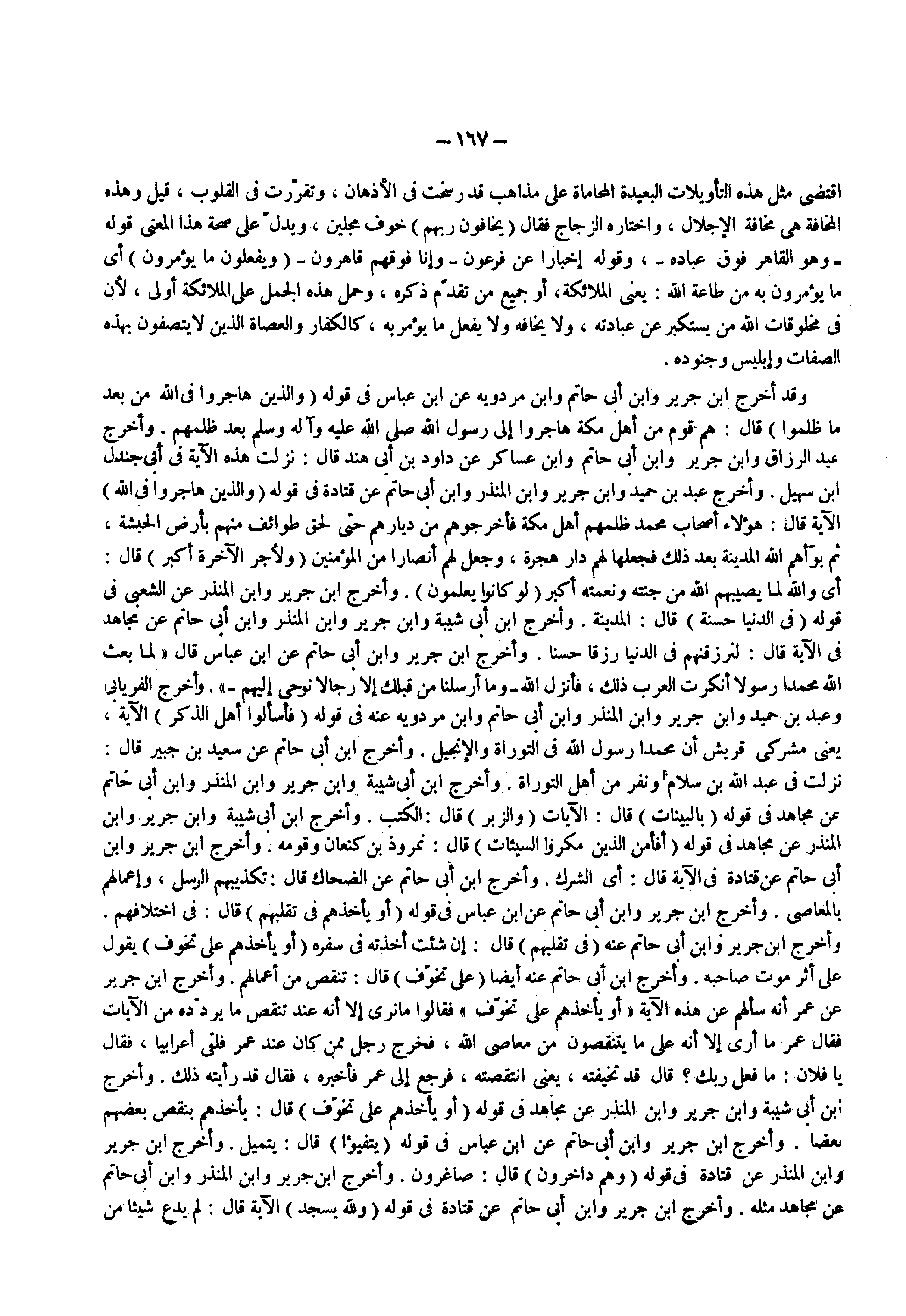 وقد أخرج ابن جرير وابن أبى حاتم وابن مردويه عن ابن عباس فى قوله ) والذين هاجروا في الله من بعد ما ظلموا ( قال هم قوم من أهل مكة هاجروا إلى رسول الله ( صلى الله عليه وسلم ) بعد ظلمهم وأخرج عبد الرزاق وابن جرير وابن أبى حاتم وابن عساكر عن داود بن أبى هند قال نزلت هذه الآية فى أبى جندل ابن سهيل وأخرج عبد بن حميد وابن جرير وابن المنذر وابن أبى حاتم عن قتادة فى قوله ) والذين هاجروا في الله ( الآية قال هؤلاء أصحاب محمد ظلمهم أهل مكة فأخرجوهم من ديارهم حتى لحق طوائف منهم بأرض الحبشة ثم بوأهم الله المدينة بعد ذلك فجعلها لهم دار هجرة وجعل لهم أنصارا من المؤمنين ) ولأجر الآخرة أكبر ( قال أى والله لما يصيبهم الله من جنته ونعمته أكبر ) لو كانوا يعلمون ( وأخرج ابن جرير وابن المنذر عن الشعبى فى قوله ) في الدنيا حسنة ( قال المدينة وأخرج ابن أبى شيبة وابن جرير وابن المنذر وابن أبى حاتم عن مجاهد فى الآية قال لنرزقنهم فى الدنيا رزقا حسنا وأخرج ابن جرير وابن أبى حاتم عن ابن عباس قال لما بعث الله محمدا رسولا أنكرت العرب ذلك فأنزل الله ) وما أرسلنا من قبلك إلا رجالا نوحي إليهم ( وأخرج الفريابى وعبد بن حميد وابن جرير وابن المنذر وابن أبى حاتم وابن مردويه عنه فى قوله ) فاسألوا أهل الذكر ( الآية يعنى مشركى قريش أن محمدا رسول الله فى التوراة والإنجيل وأخرج ابن أبى حاتم عن سعيد بن جبير قال نزلت فى عبد الله بن سلام ونفر من أهل التوراة وأخرج ابن أبى شيبة وابن جرير وابن المنذر وابن أبى حاتم عن مجاهد فى قوله ) بالبينات ( قال الآيات ) والزبر ( قال الكتب وأخرج ابن أبى شيبة وابن جرير وابن المنذر عن مجاهد فى قوله ) أفأمن الذين مكروا السيئات ( قال نمروذ بن كنعان وقومه وأخرج ابن جرير وابن أبى حاتم عن قتادة فى الآية قال أى الشرك وأخرج ابن أبى حاتم عن الضحاك قال تكذيبهم الرسل وإعمالهم بالمعاصى وأخرج ابن جرير وابن أبى حاتم عن ابن عباس فى قوله ) أو يأخذهم في تقلبهم ( قال فى اختلافهم وأخرج ابن جرير وابن أبى حاتم عنه ) في تقلبهم ( قال إن شئت أخذته فى سفره ) أو يأخذهم على تخوف ( يقول على أثر موت صاحبه وأخرج ابن أبى حاتم عنه أيضا ) على تخوف ( قال تنقص من أعمالهم وأخرج ابن جرير عن عمر أنه سألهم عن هذه الآية ) أو يأخذهم على تخوف ( فقالوا ما نرى إلا أنه عند تنقص ما يردده من الآيات فقال عمر ما أرى إلا أنه على ما يتنقصون من معاصى الله فخرج رجل ممن كان عند عمر فلقى أعرابيا فقال يا فلان ما فعل ربك قال قد تخيفته يعنى انتقصته فرجع إلى عمر فأخبره فقال قد رأيته ذلك وأخرج ابن أبى شيبة وابن جرير وابن المنذر عن مجاهد فى قوله ) أو يأخذهم على تخوف ( قال يأخذهم بنقص بعضهم بعضا وأخرج ابن جرير وابن أبى حاتم عن ابن عباس فى قوله ) يتفيأ ( قال يتميل وأخرج ابن جرير وابن المنذر عن قتادة فى قوله ) وهم داخرون ( قال صاغرون وأخرج ابن جرير وابن المنذر وابن أبى حاتم عن مجاهد مثله وأخرج ابن جرير وابن أبى حاتم عن قتادة فى قوله ) ولله يسجد ( الآية قال لم يدع شيئا من