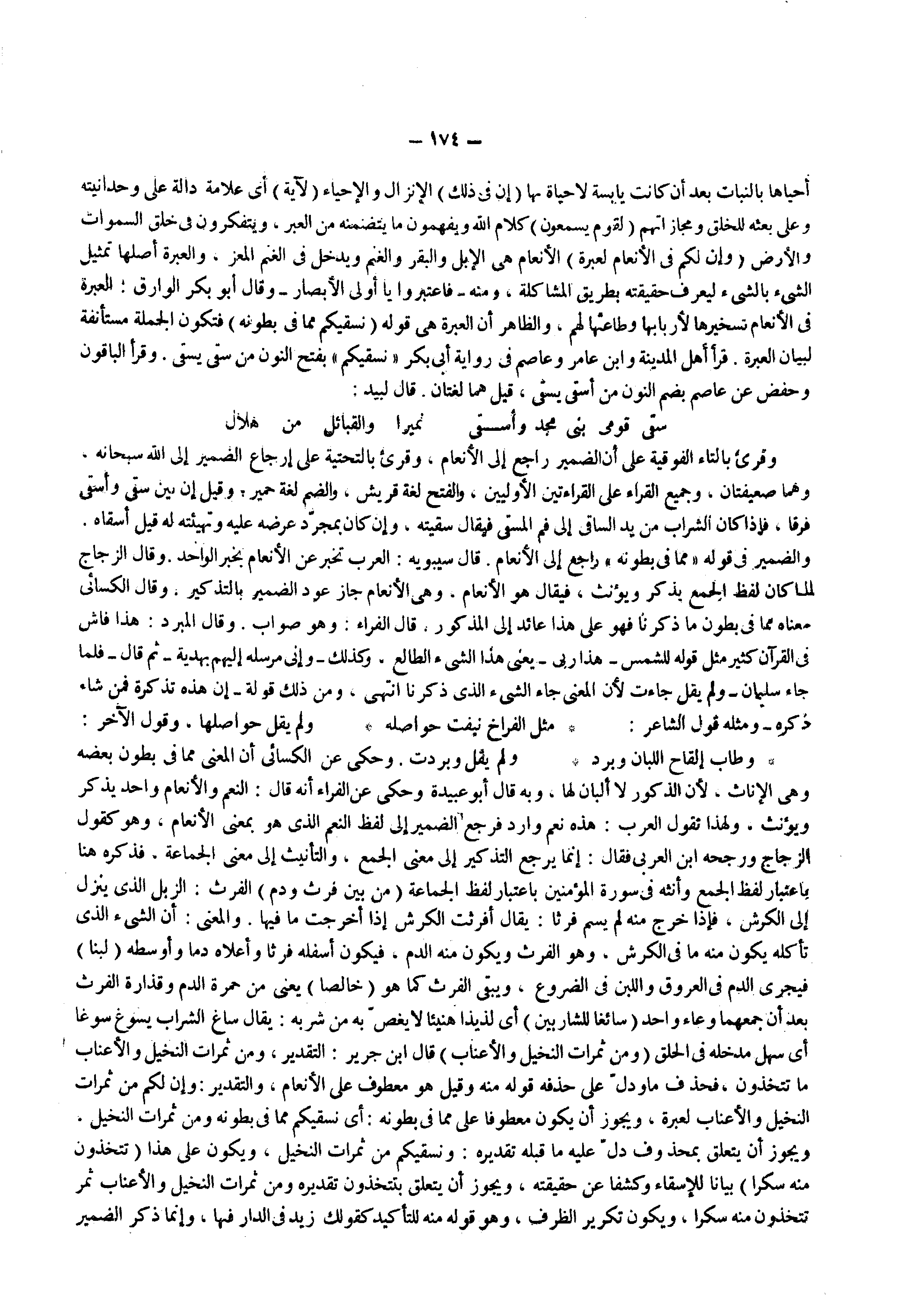 ) وإن لكم في الأنعام لعبرة ( الأنعام هى الإبل والبقر والغنم ويدخل فى الغنم المعز والعبرة أصلها تمثيل الشيء بالشيء ليعرف حقيقته بطريق المشاكلة ومنه ) فاعتبروا يا أولي الأبصار ( وقال أبو بكر الوارق العبرة فى الأنعام تسخيرها لأربابها وطاعتها لهم والظاهر أن العبرة هى قوله ) نسقيكم مما في بطونه ( فتكون الجملة مستأنفة لبيان العبرة قرأ أهل المدينة وابن عامر وعاصم فى رواية أبى بكر نسقيكم بفتح النون من سقى يسقى وقرأ الباقون وحفص عن عاصم بضم النون من أسقى يسقى قيل هما لغتان قال لبيد سقى قومى بنى مجد وأسقى