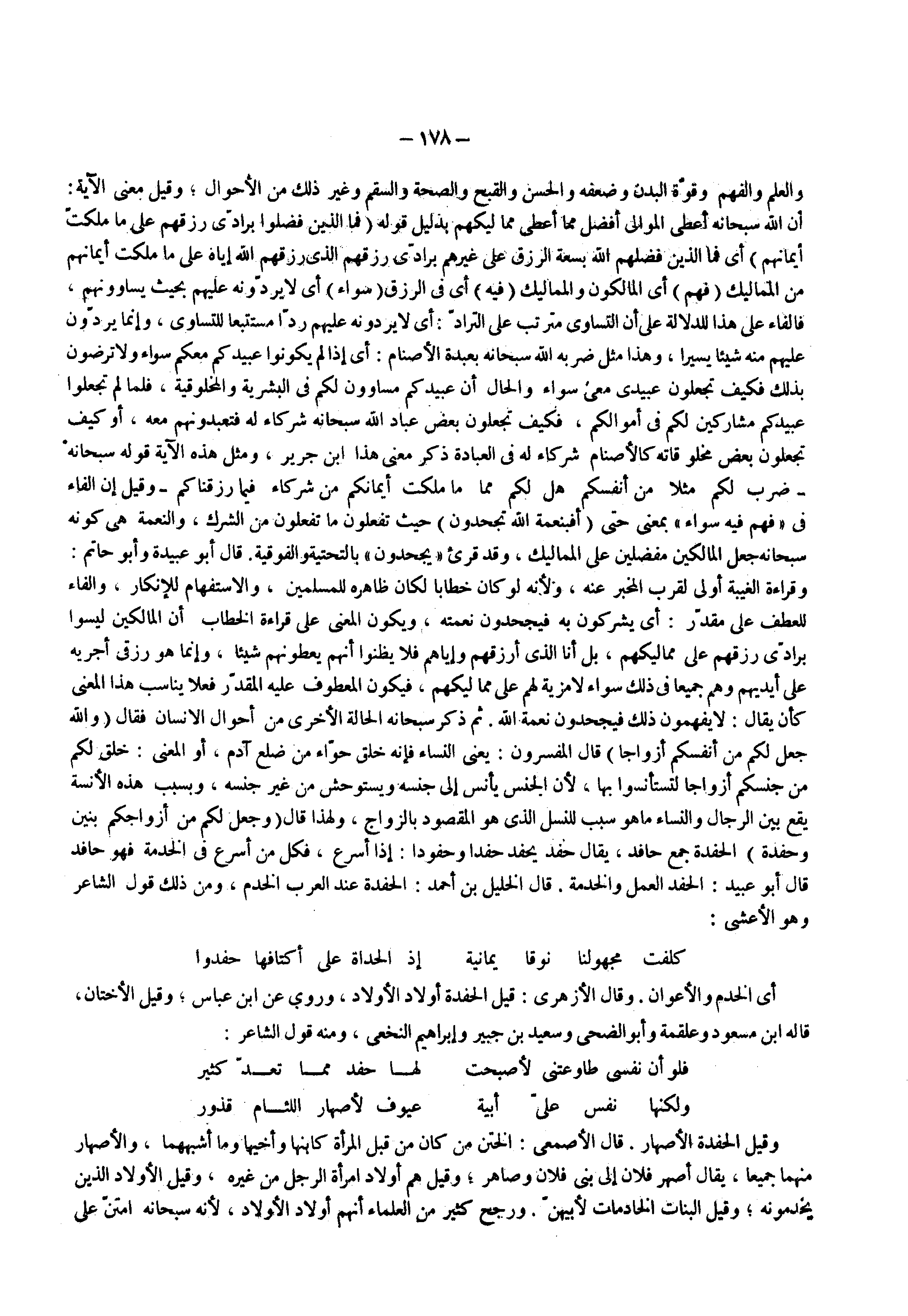 والعلم والفهم وقوة البدن وضعفه والحسن والقبح والصحة والسقم وغير ذلك من الأحوال وقيل معنى الآية أن الله سبحانه أعطى الموالى أفضل مما أعطى مماليكهم بدليل قوله ) فما الذين فضلوا برادي رزقهم على ما ملكت أيمانهم ( أى فما الذين فضلهم الله بسعة الرزق على غيرهم برادى رزقهم الذى رزقهم الله إياه على ما مكلت أيمانهم من المماليك ) فهم ( أى المالكون والمماليك ) فيه ( أى فى الرزق ) سواء ( أى لا يردونه عليهم بحيث يساوونهم فالفاء على هذا للدلالة على أن التساوى مترتب على التراد أى لا يردونه عليهم ردا مستتبعا للتساوى وإنما يردون عليهم منه شيئا يسيرا وهذا مثل ضربه الله سبحانه بعبدة الأصنام أى إذا لم يكونوا عبيدكم معكم سواء ولا ترضون بذلك فكيف تجعلون عبيدى معى سواء والحال أن عبيدكم مساوون لكم فى البشرية والمخلوقية فلما لم تجعلوا عبيدكم مشاركين لكم فى أموالكم فيكف تجعلون بعض عباد الله سبحانه شركاء له فتعبدونهم معه أو كيف تجعلون بعض مخلوقاته كالأصنام شركاء له فى العبادة ذكر معنى هذا ابن جرير ومثل هذه الآية قوله سبحانه ) ضرب لكم مثلا من أنفسكم هل لكم من ما ملكت أيمانكم من شركاء في ما رزقناكم ( وقيل إن الفاء فى فهم فيه سواء بمعنى حتى ) أفبنعمة الله يجحدون ( حيث تفعلون ما تفعلون من الشرك والنعمة هى كونه سبحانه جعل المالكين مفضلين على المماليك وقد قرئ يجحدون بالتحتيه والفوقية قال أبو عبيدة وأبو حاتم وقراءة الغيبة أولى لقرب المخبر عنه ولأنه لو كان خطابا لكان ظاهره للمسلمين والاستفهام للإنكار والفاء للعطف على مقدر أى يشركون به فيجحدون نعمته ويكون المعنى على قراءة الخطاب أن المالكين ليسوا برادى رزقهم على مماليكهم بل أنا الذى أرزقهم وإياهم فلا يظنوا أنهم يعطونهم شيئا وإنما هو رزقى أجريه على أيديهم وهم جميعا فى ذلك سواء لا مزية لهم على مماليكهم فيكون المعطوف عليه المقدر فعلا يناسب هذا المعنى كأن يقال لا يفهمون ذلك فيجحدون نعمة الله