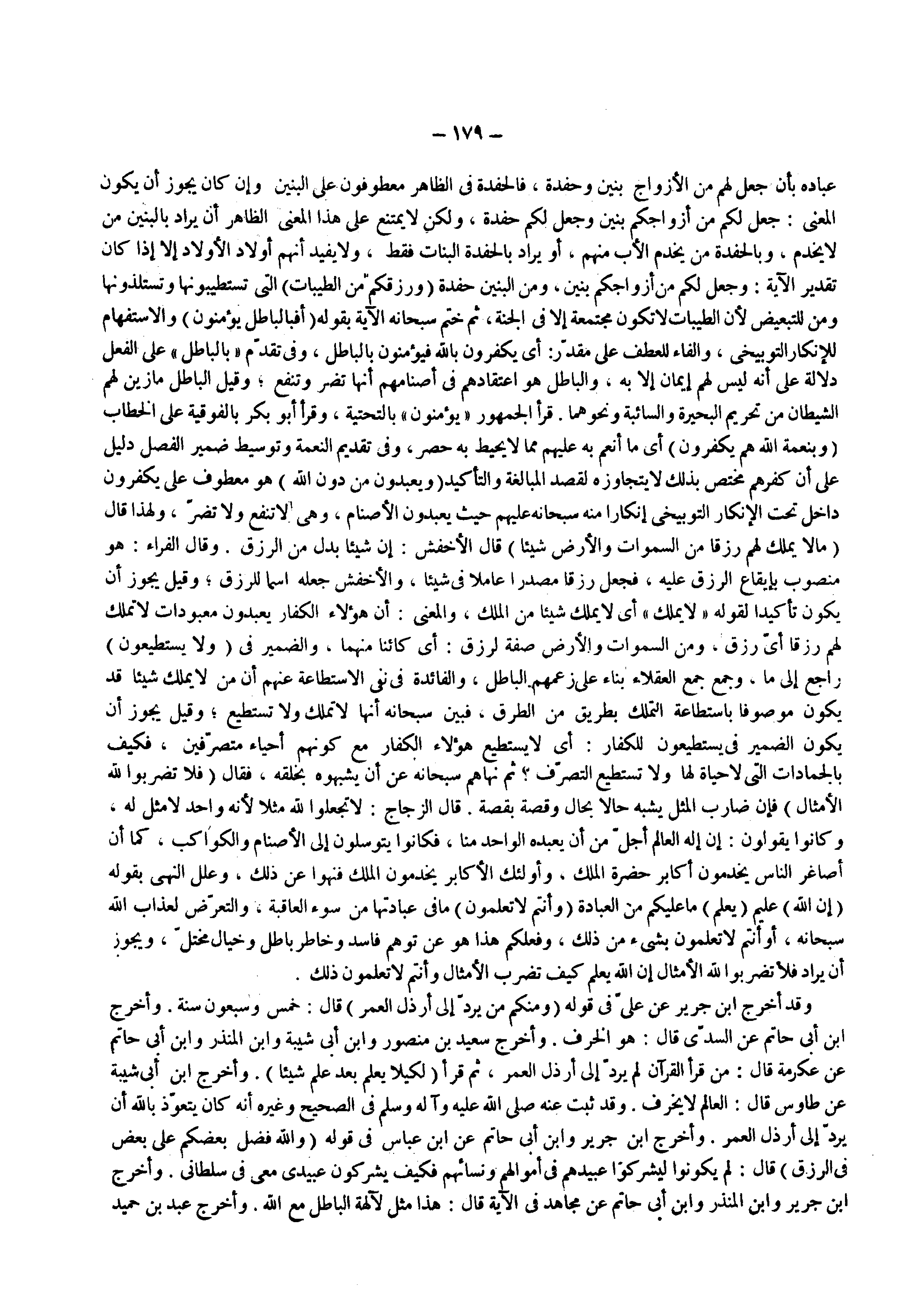 وقد أخرج ابن جرير عن على فى قوله ) ومنكم من يرد إلى أرذل العمر ( قال خمس وسبعون سنة وأخرج ابن أبى حاتم عن السدى قال هو الخرف وأخرج سعيد بن منصور وابن أبى شيبة وابن المنذر وابن أبى حاتم عن عكرمة قال من قرأ القرآن لم يرد إلى أرذل العمر ثم قرأ ? لكيلا يعلم بعد علم شيئا ? وأخرج ابن أبى شيبة عن طاوس قال العالم لا يخرف وقد ثبت عنه ( صلى الله عليه وسلم ) فى الصحيح وغيره أنه كان يتعوذ بالله أن يرد إلى أرذل العمر وأخرج ابن جرير وابن أبى حاتم عن ابن عباس فى قوله ) والله فضل بعضكم على بعض في الرزق ( قال لم يكونوا ليشركوا عبيدهم فى أموالهم ونسائهم فكيف يشركون عبيدى معى فى سلطانى وأخرج ابن جرير وابن المنذر وابن أبى حاتم عن مجاهد فى الآية قال هذا مثل لآلهة الباطل مع الله وأخرج عبد بن حميد