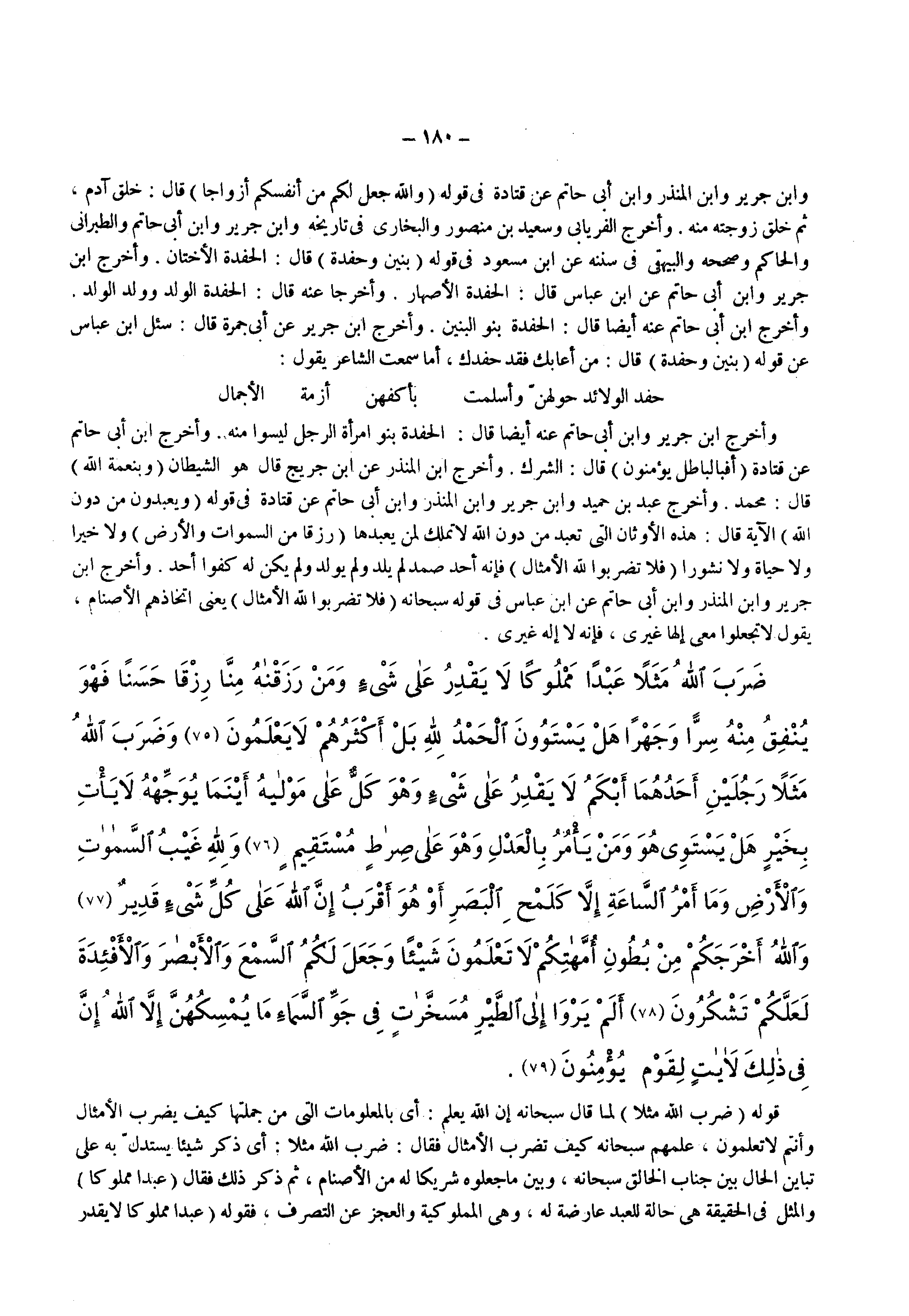 وأخرج ابن جرير وابن أبى حاتم عنه أيضا قال الحفدة بنو امرأة الرجل ليسوا منه وأخرج ابن أبى حاتم عن قتادة ) أفبالباطل يؤمنون ( قال الشرك وأخرج ابن المنذر عن ابن جريج قال هو الشيطان ) وبنعمة الله ( قال محمد وأخرج عبد بن حميد وابن جرير وابن المنذر وابن أبى حاتم عن قتادة فى قوله ) ويعبدون من دون الله ( الآية قال هذه الأوثان التى تعبد من دون الله لا تملك لمن يعبدها ) رزقا من السماوات والأرض ( ولا خيرا ولا حياة ولا نشورا ) فلا تضربوا لله الأمثال ( فإنه أحد صمد لم يلد ولم يولد ولم يكن له كفوا أحد وأخرج ابن جرير وابن المنذر وابن أبى حاتم عن ابن عباس فى قوله سبحانه ) فلا تضربوا لله الأمثال ( يعنى اتخاذهم الأصنام يقول لا تجعلوا معى إلها غيرى فإنه لا إله غيرى