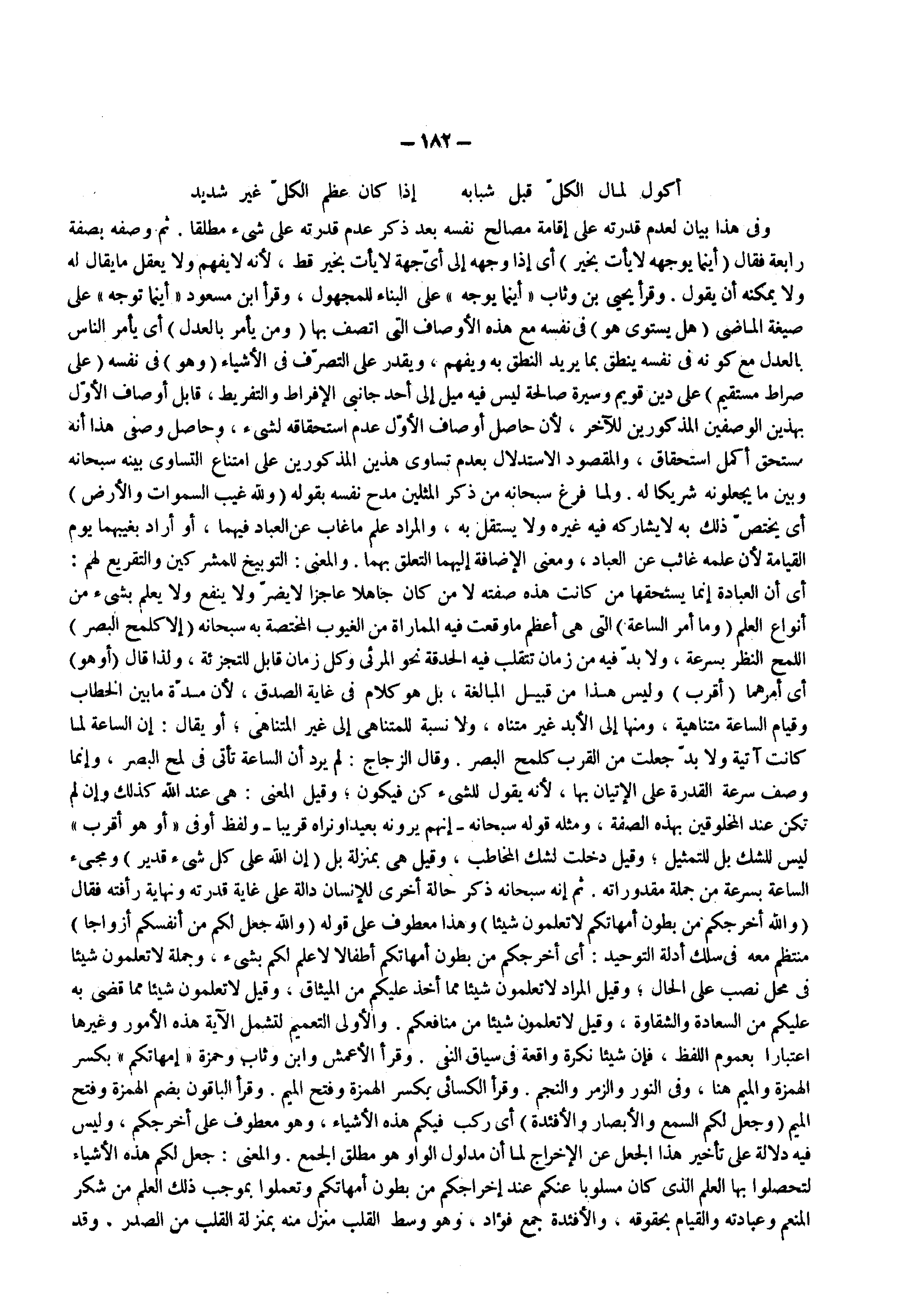 ثم إنه سبحانه ذكر حالة أخرى للإنسان دالة على غاية قدرته ونهاية رأفته فقال ) والله أخرجكم من بطون أمهاتكم لا تعلمون شيئا ( وهذا معطوف على قوله ) والله جعل لكم من أنفسكم أزواجا ( منتظم معه فى سلك أدلة التوحيد أى أخرجكم من بطون أمهاتكم أطفالا لا علم لكم بشئ وجملة لا تعلمون شيئا فى محل نصب على الحال وقيل المراد لا تعلمون شيئا مما أخذ عليكم من الميثاق وقيل لا تعلمون شيئا مما قضى به عليكم من السعادة والشقاوة وقيل لا تعلمون شيئا من منافعكم والأولى التعميم لتشمل الآية هذه الأمور وغيرها اعتبارا بعموم اللفظ فإن شيئا نكرة واقعة في سياق النفى وقرأ الأعمش وابن وثاب وحمزة إمهاتكم بكسر الهمزة الميم هنا وفى النور والزمر والنجم وقرأ الكسائى بكسر الهمزة وفتح الميم وقرأ الباقون بضم الهمزة وفتح الميم ) وجعل لكم السمع والأبصار والأفئدة ( أى ركب فيكم هذه الأشياء وهو معطوف على أخرجكم وليس فيه دلالة على تأخير هذا الجعل عن الإخراج لما أن مدلول الواو وهو مطلق الجمع والمعنى جعل لكم هذه الأشياء لتحصلوا بها العلم الذى كان مسلوبا عنكم عند إخراجكم من بطون أمهاتكم وتعملوا بموجب العلم من شكر المنعم وعبادته والقيام بحقوقه والأفئدة جمع فؤاد وهو وسط القلب منزل منه بمنزلة القلب من الصدر وقد