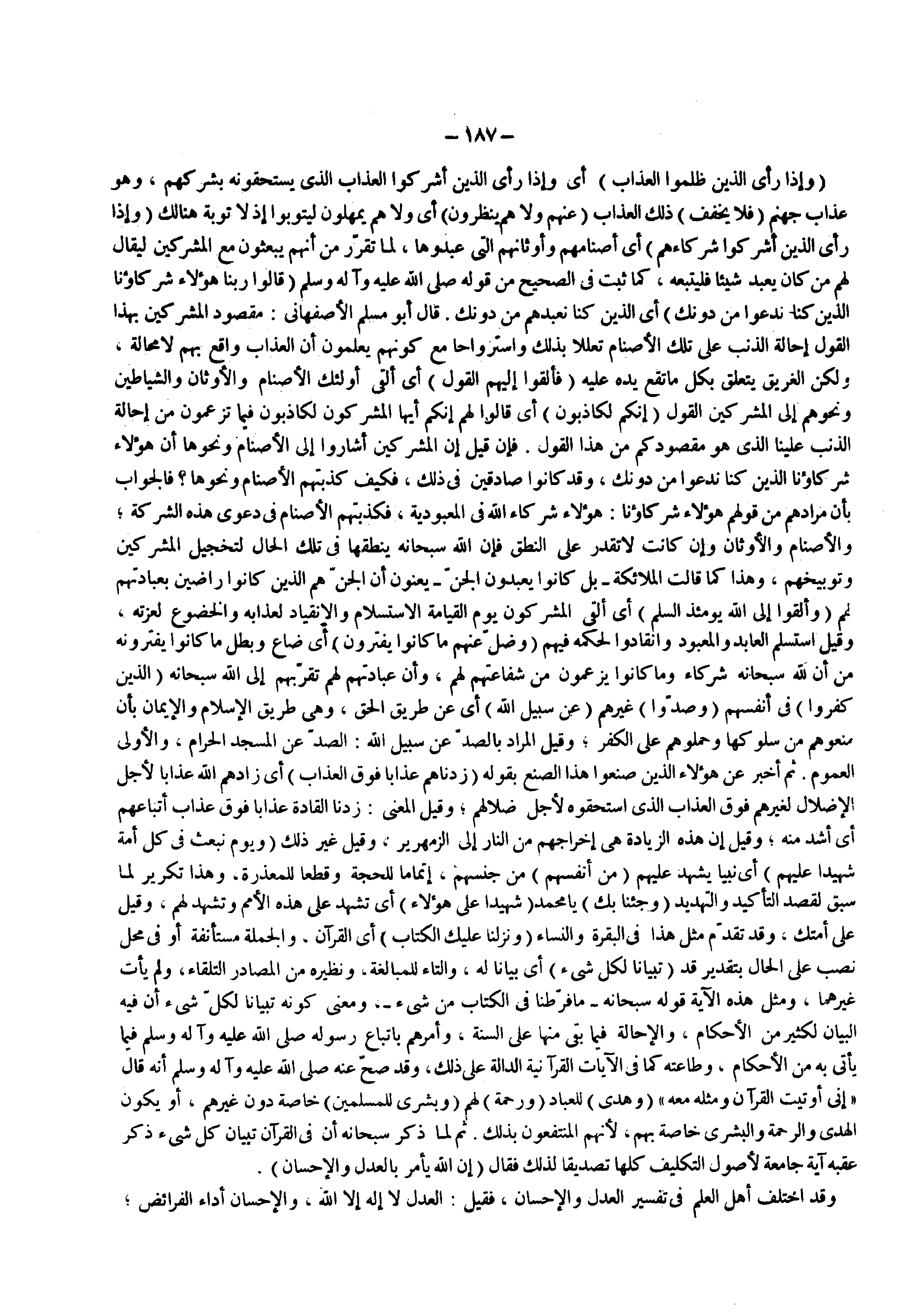 ثم لما ذكر سبحانه أن فى القرآن تبيان كل شئ ذكر عقبة آية جامعة لأصول التكليف كلها تصديقا لذلك فقال ) إن الله يأمر بالعدل والإحسان ( وقد اختلف أهل العلم فى تفسير العدل والإحسان فقيل العدل لا إله إلا الله والإحسان أداء الفرائض
