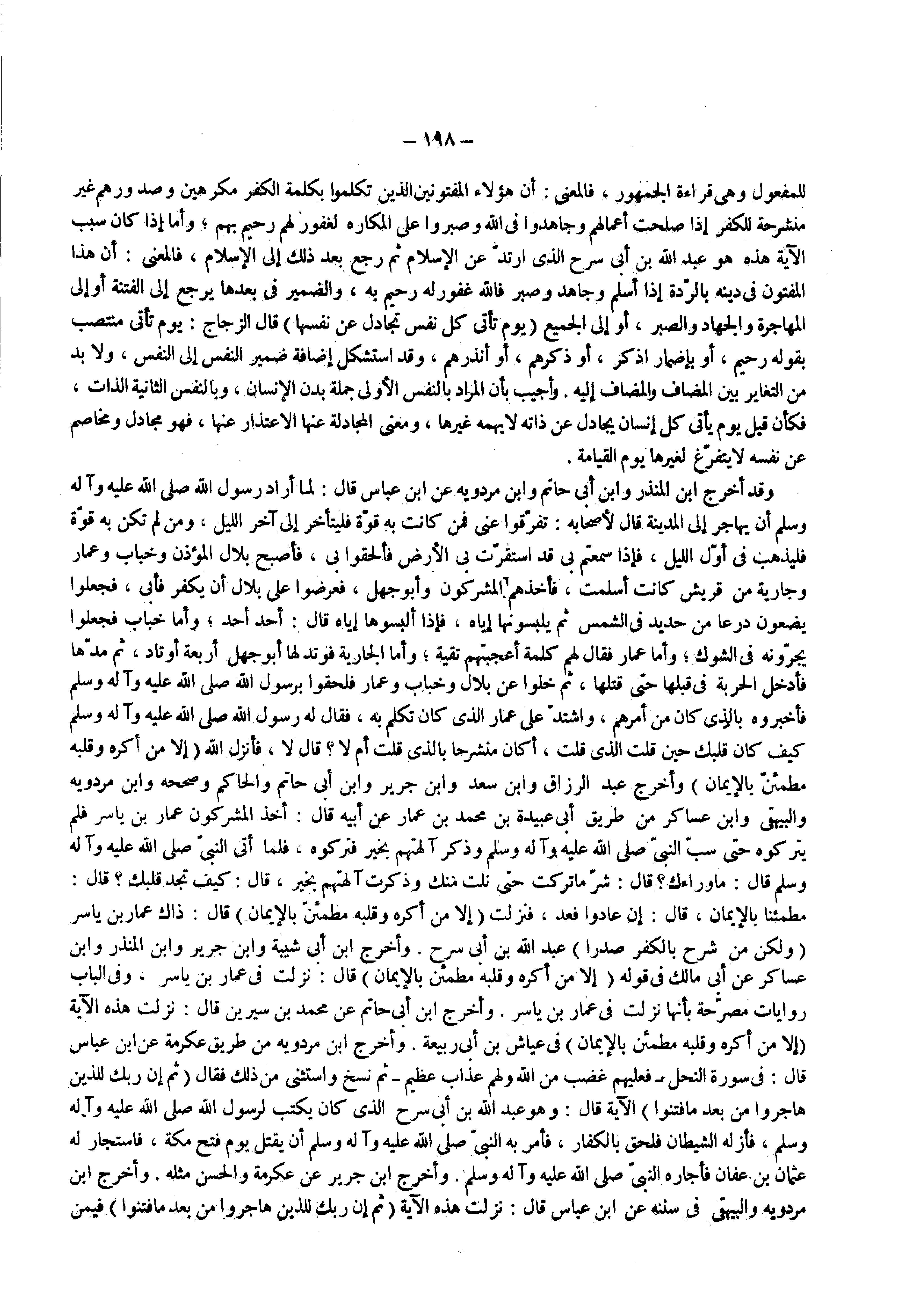وقد أخرج ابن المنذر وابن أبي حاتم وابن مردويه عن ابن عباس قال لما أراد رسول الله ( صلى الله عليه وسلم ) أن يهاجر إلى المدينة قال لأصحابه تفرقوا عني فمن كانت به قوة فليتأخر إلى آخر الليل ومن لم تكن به قوة فليذهب فى أول الليل فإذا سمعتم بي قد استقرت بي الأرض فألحقوا بي فأصبح بلال المؤذن وخباب وعمار وجارية من قريش كانت أسلمت فأخذهم المشركون وأبو جهل فعرضوا على بلال أن يكفر فأبى فجعلوا يضعون درعا من حديد فى الشمس ثم يلبسونها إياه فإذا ألبسوها إياه قال أحد أحد وأما خباب فجعلوا يجرونه فى الشوك وأما عمار فقال لهم كلمة أعجبتهم تقية وأما الجارية فوتد لها أبو جهل أربعة أوتاد ثم مدها فأدخل الحربة فى قبلها حتى قتلها ثم خلوا عن بلال وخباب وعمار فلحقوا برسول الله ( صلى الله عليه وسلم ) فأخبروه بالذى كان من أمرهم واشتد على عمار الذى كان تكلم به فقال له رسول الله ( صلى الله عليه وسلم ) كيف كان قلبك حين قلت الذى قلت أكان منشرحا بالذى قلت أم لا قال لا فأنزل الله ) إلا من أكره وقلبه مطمئن بالإيمان ( وأخرج عبد الرزاق وابن سعد وابن جرير وابن أبي حاتم والحاكم وصححه وابن مردويه والبيهقي وابن عساكر من طريق أبي عبيدة بن محمد بن عمار عن أبيه قال أخذ المشركون عمار بن ياسر فلم يتركوه حتى سب النبي ( صلى الله عليه وسلم ) وذكر آلهتهم بخير فتركوه فلما أتى النبي ( صلى الله عليه وسلم ) قال ما وراءك قال شر ما تركت حتى نلت منك وذكرت آلهتهم بخير قال كيف تجد قلبك قال مطمئنا بالإيمان قال إن عادوا فعد فنزلت ) إلا من أكره وقلبه مطمئن بالإيمان ( قال ذاك عمار بن ياسر ) ولكن من شرح بالكفر صدرا ( عبد الله بن أبي سرح وأخرج ابن أبي شيبة وابن جرير وابن المنذر وابن عساكر عن أبي مالك فى قوله ) إلا من أكره وقلبه مطمئن بالإيمان ( قال نزلت فى عمار بن ياسر وفى الباب روايات مصرحة بأنها نزلت فى عمار بن ياسر وأخرج ابن أبي حاتم عن محمد بن سيرين قال نزلت هذه الآية ) إلا من أكره وقلبه مطمئن بالإيمان ( فى عياش بن أبي ربيعة وأخرج ابن مردويه من طريق عكرمة عن ابن عباس قال فى سورة النحل ) فعليهم غضب من الله ولهم عذاب عظيم ( ثم نسخ واستثنى من ذلك فقال ) ثم إن ربك للذين هاجروا من بعد ما فتنوا ( الآية قال وهو عبد الله بن أبي سرح الذى كان يكتب لرسول الله ( صلى الله عليه وسلم ) فأزله الشيطان فلحق بالكفار فأمر به النبي ( صلى الله عليه وسلم ) أن يقتل يوم فتح مكة فاستجار له عثمان بن عفان فاجاره النبي ( صلى الله عليه وسلم ) وأخرج ابن جرير عن عكرمة والحسن مثله وأخرج ابن مردويه والبيهقي فى سننه عن ابن عباس قال نزلت هذه الآية ) ثم إن ربك للذين هاجروا من بعد ما فتنوا ( فيمن