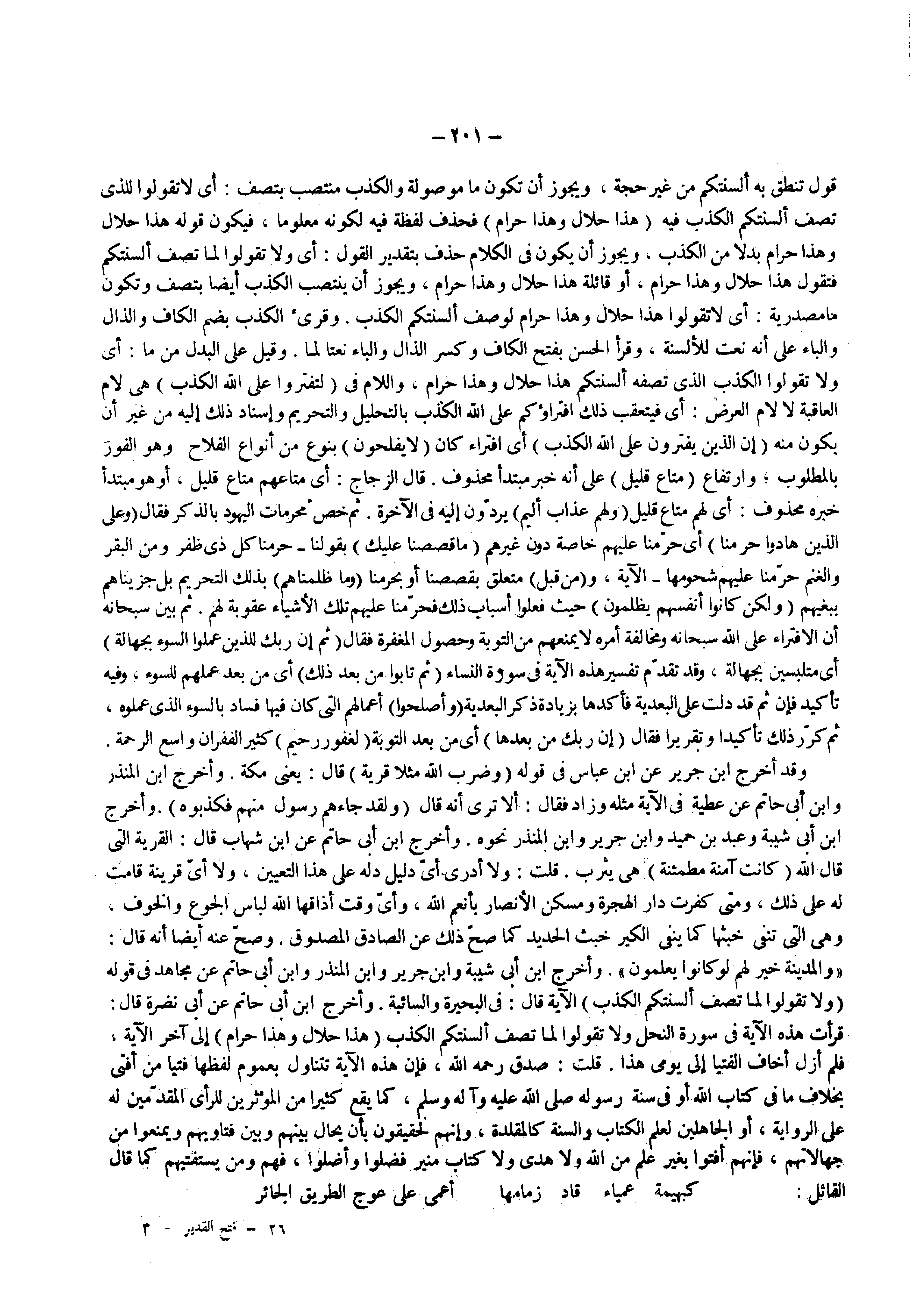 وقد أخرج ابن جرير عن ابن عباس فى قوله ) وضرب الله مثلا قرية ( قال يعني مكة وأخرج ابن المنذر وابن أبي حاتم عن عطية فى الآية مثله وزاد فقال ألا ترى أنه قال ) ولقد جاءهم رسول منهم فكذبوه ( وأخرج ابن أبي شيبة وعبد بن حميد وابن جرير وابن المنذر نحوه وأخرج ابن أبي حاتم عن ابن شهاب قال القرية التى قال الله ) كانت آمنة مطمئنة ( هى يثرب قلت ولا أدري أى دليل دله على هذا التعيين ولا أى قرينة قامت له على ذلك ومتى كفرت دار الهجرة ومسكن الأنصار بأنعم الله وأى وقت أذاقها الله لباس الجوع والخوف وهى التى تنفي خبثها كما ينفي الكير خبث الحديد كما صح ذلك عن الصادق المصدوق وصح عنه أيضا أنه قال والمدينة خير لهم لو كانوا يعلمون وأخرج ابن أبي شيبة وابن جرير وابن المنذر وابن أبي حاتم عن مجاهد فى قوله ) ولا تقولوا لما تصف ألسنتكم الكذب ( الآية قال فى البحيرة والسائبة وأخرج ابن أبي حاتم عن أبي نضرة قال قرأت هذه الآية فى سورة النحل ) ولا تقولوا لما تصف ألسنتكم الكذب ( ) هذا حلال وهذا حرام ( إلى آخر الآية فلم أزل أخاف الفتيا إلى يومي هذا قلت صدق رحمه الله فإن هذه الآية تتناول بعموم لفظها فتيا من أفتى بخلاف ما فى كتاب الله أو فى سنة رسوله صلى الله عليه وآله سلم كما يقع كثيرا من المؤثرين للرأي المقدمين له على الرواية أو الجاهلين لعلم الكتاب والسنة كالمقلدة وإنهم لحقيقون بأن يحال بينهم وبين فتاويهم ويمنعوا من جهالاتهم فإنهم أفتوا بغير علم من الله ولا هدى ولا كتاب منير فضلوا وأضلوا فهم ومن يستفتيهم كما قال القائل كبهيمة عمياء قاد زمامها