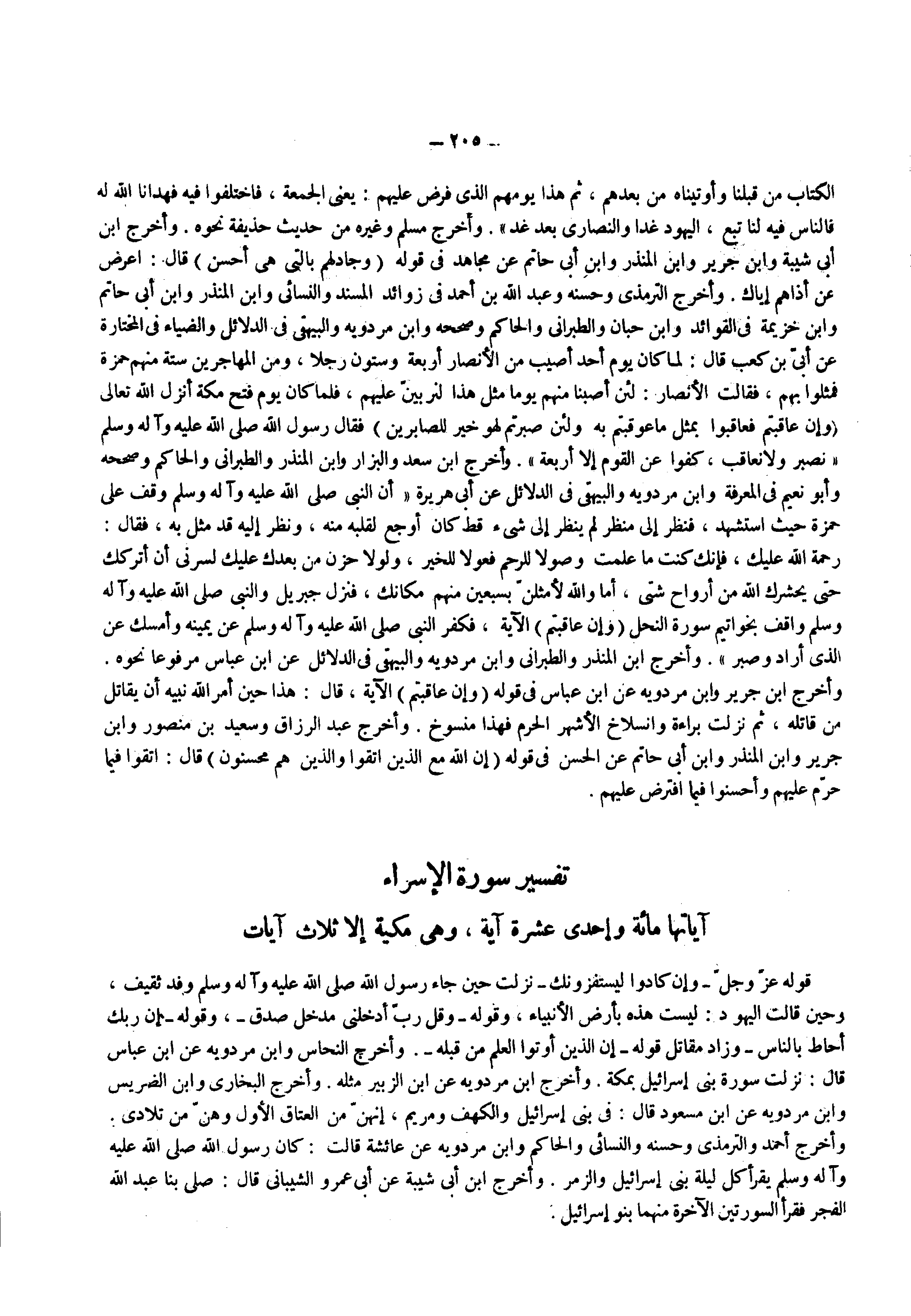 الكتاب من قبلنا وأوتيناه من بعدهم ثم هذا يومهم الذى فرض عليهم يعني الجمعة فاختلفوا فيه فهدانا الله له فالناس فيه لنا تبع اليهود غدا والنصارى بعد غد وأخرج مسلم وغيره من حديث حذيفة نحوه وأخرج ابن أبي شيبة وابن جرير وابن المنذر وابن أبي حاتم عن مجاهد فى قوله ) وجادلهم بالتي هي أحسن ( قال اعرض عن أذاهم إياك وأخرج الترمذي وحسنه وعبد الله بن أحمد فى زوائد المسند والنسائي وابن المنذر وابن أبي حاتم وابن خزيمة فى الفوائد وابن حبان والطبراني والحاكم وصححه وابن مردويه والبيهقي فى الدلائل والضياء فى المختارة عن أبي بن كعب قال لما كان يوم أحد أصيب من الأنصار أربعة وستون رجلا ومن المهاجرين ستة منهم حمزة فمثلوا بهم فقالت الأنصار لئن أصبنا منهم يوما مثل هذا لنربين عليهم فلما كان يوم فتح مكة أنزل الله تعالى ) وإن عاقبتم فعاقبوا بمثل ما عوقبتم به ولئن صبرتم لهو خير للصابرين ( فقال رسول الله ( صلى الله عليه وسلم ) نصبر ولا نعاقب كفوا عن القوم إلا أربعة وأخرج ابن سعد والبزار وابن المنذر والطبراني والحاكم وصححه وأبو نعيم فى المعرفة وابن مردويه والبيهقي فى الدلائل عن أبي هريرة أن النبي ( صلى الله عليه وسلم ) وقف على حمزة حيث استشهد فنظر إلى منظر لم ينظر إلى شيء قط كان أوجع لقلبه منه ونظر إليه قد مثل به فقال رحمة الله عليك فإنك كنت ما علمت وصولا للرحم فعولا للخير ولولا حزن من بعدك عليك لسرني أن أتركك حتى يحشرك الله من أرواح شتى أما والله لأمثلن بسبعين منهم مكانك فنزل جبريل والنبي ( صلى الله عليه وسلم ) واقف بخواتيم سورة النحل ) وإن عاقبتم ( الآية فكفر النبي ( صلى الله عليه وسلم ) عن يمينه وأمسك عن الذى أراد وصبر وأخرج ابن المنذر والطبراني وابن مردويه والبيهقي فى الدلائل عن ابن عباس مرفوعا نحوه وأخرج ابن جرير وابن مردويه عن ابن عباس فى قوله ) وإن عاقبتم ( الآية قال هذا حين أمر الله نبيه أن يقاتل من قاتله ثم نزلت براءة وانسلاخ الأشهر الحرم فهذا منسوخ وأخرج عبد الرزاق وسعيد بن منصور وابن جرير وابن المنذر وابن أبي حاتم عن الحسن فى قوله ) إن الله مع الذين اتقوا والذين هم محسنون ( قال اتقوا فيما حرم عليهم وأحسنوا فيما افترض عليهم