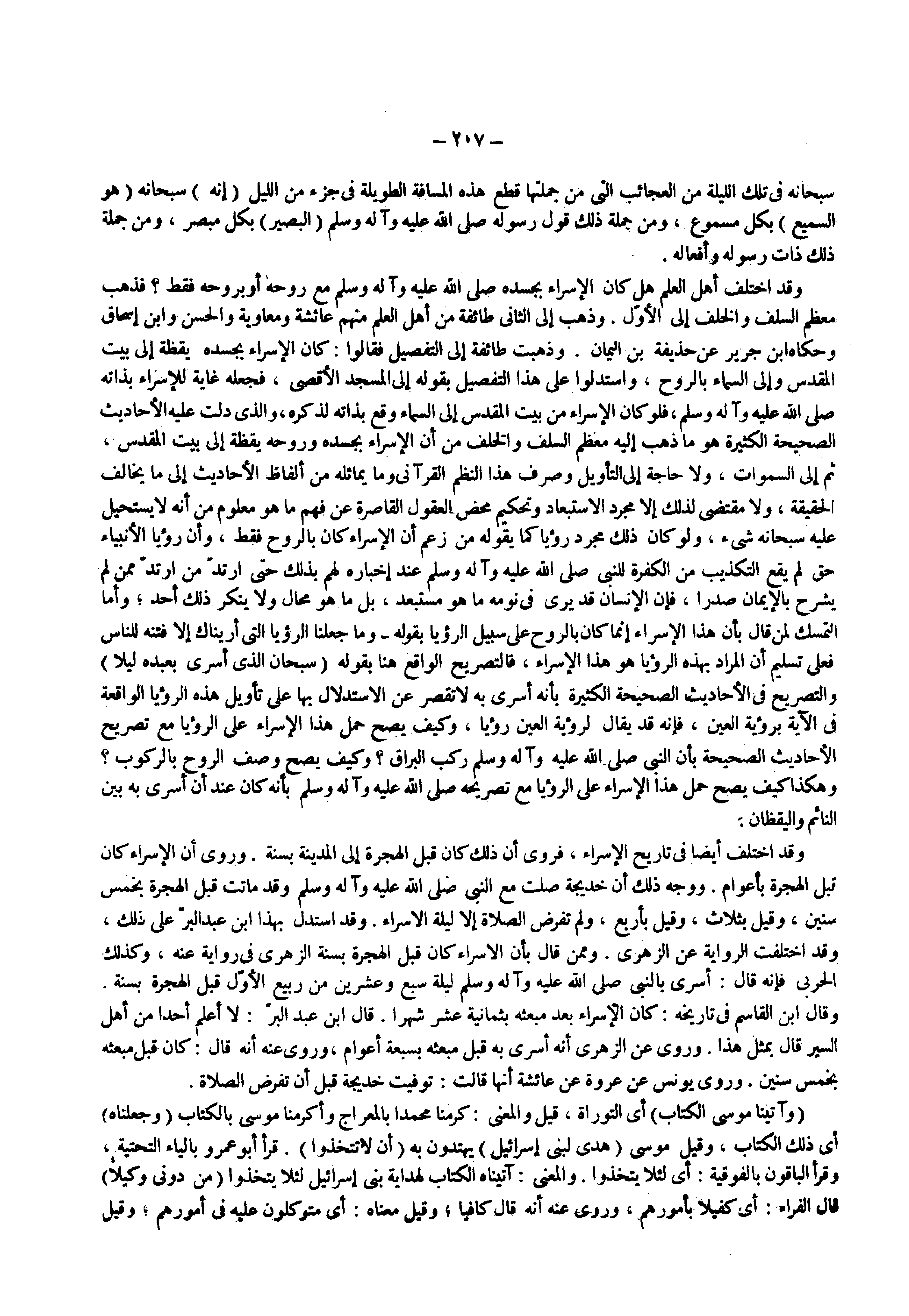 وقد اختلف أهل العلم هل كان الإسراء بجسده ( صلى الله عليه وسلم ) مع روحه أو بروحه فقط فذهب معظم السلف والخلف إلى الأول وذهب إلى الثاني طائفة من أهل العلم منهم عائشة ومعاوية والحسن وابن إسحاق وحكاه ابن جرير عن حذيفة بن اليمان وذهبت طائفة إلى التفصيل فقالوا كان الإسراء بجسده يقظة إلى بيت المقدس وإلى السماء بالروح واستدلوا على هذا التفصيل بقوله إلى المسجد الأقصى فجعله غاية للإسراء بذاته ( صلى الله عليه وسلم ) فلو كان الإسراء من بيت المقدس إلى السماء وقع بذاته لذكره والذى دلت عليه الأحاديث الصحيحة الكثيرة هو ما ذهب إليه معظم السلف والخلف من أن الإسراء بجسده وروحه يقظة إلى بيت المقدس ثم إلى السموات ولا حاجة إلى التأويل وصرف هذا النظم القرآني وما يمائله من ألفاظ الأحاديث إلى ما يخالف الحقيقة ولا مقتضى لذلك إلا مجرد الاستبعاد وتحكيم محض العقول القاصرة عن فهم ما هو معلوم من أنه لا يستحيل عليه سبحانه شيء ولو كان ذلك مجرد رؤيا كما يقوله من زعم أن الإسراء كان بالروح فقط وأن رؤيا الأنبياء حق لم يقع التكذيب من الكفرة للنبي ( صلى الله عليه وسلم ) عند إخباره لهم بذلك حتى ارتد من ارتد ممن لم يشرح بالإيمان صدرا فإن الإنسان قد يرى فى نومه ما هو مستبعد بل ما هو محال ولا ينكر ذلك أحد وأما التمسك لمن قال بأن هذا الإسراء إنما كان بالروح على سبيل الرؤيا بقوله ) وما جعلنا الرؤيا التي أريناك إلا فتنة للناس ( فعلى تسليم أن المراد بهذه الرؤيا هو هذا الإسراء فالتصريح الواقع هنا بقوله ) سبحان الذي أسرى بعبده ليلا ( والتصريح فى الأحاديث الصحيحة الكثيرة بأنه أسرى به لا تقصر عن الاستدلال بها على تأويل هذه الرؤيا الواقعة فى الآية برؤية العين فإنه قد يقال لرؤية العين رؤيا وكيف يصح حمل هذا الإسراء على الرؤيا مع تصريح الأحاديث الصحيحة بأن النبي ( صلى الله عليه وسلم ) ركب البراق وكيف يصح وصف الروح بالركوب وهكذا كيف يصح حمل هذا الإسراء على الرؤيا مع تصريحه ( صلى الله عليه وسلم ) بأنه كان عند أن أسرى به بين النائم واليقظان