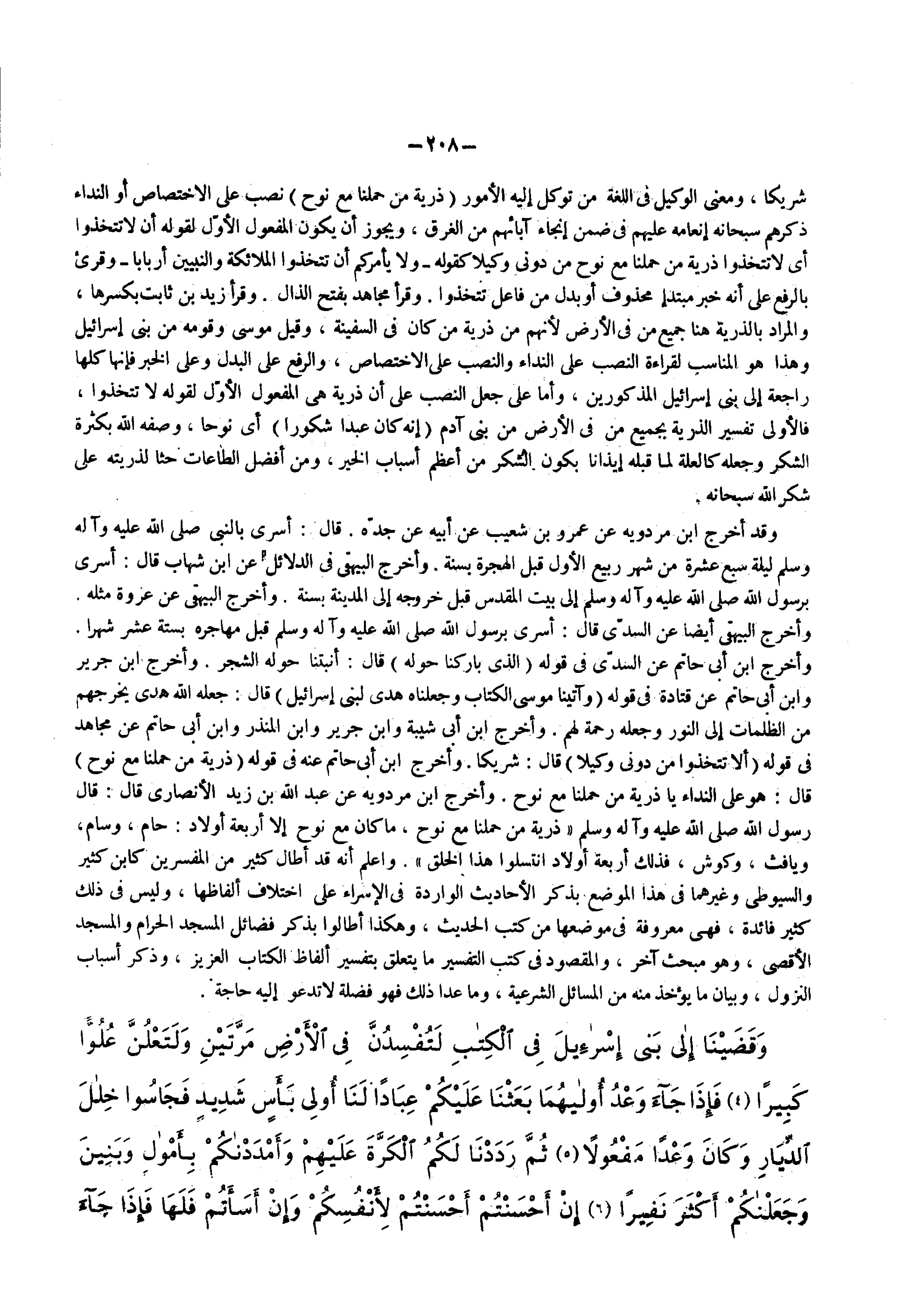 وقد أخرج ابن مردويه عن عمرو بن شعيب عن أبيه عن جده قال أسرى بالنبي ( صلى الله عليه وسلم ) ليلة سبع عشرة من شهر ربيع الأول قبل الهجرة بسنة وأخرج البيهقي فى الدلائل عن ابن شهاب قال أسرى برسول الله ( صلى الله عليه وسلم ) إلى بيت المقدس قبل خروجه إلى المدينة بسنة وأخرج البيهقي عن عروة مثله وأخرج البيهقي أيضا عن السدي قال أسرى برسول الله ( صلى الله عليه وسلم ) قبل مهاجره بستة عشر شهرا وأخرج ابن أبي حاتم عن السدي فى قوله ) الذي باركنا حوله ( قال أنبتنا حوله الشجر وأخرج ابن جرير وابن أبي حاتم عن قتادة فى قوله ) وآتينا موسى الكتاب وجعلناه هدى لبني إسرائيل ( قال جعله الله هدى يخرجهم من الظلمات إلى النور وجعله رحمة لهم وأخرج ابن أبي شيبة وابن جرير وابن المنذر وابن أبي حاتم عن مجاهد فى قوله ) ألا تتخذوا من دوني وكيلا ( قال شريكا وأخرج ابن أبي حاتم عنه فى قوله ) ذرية من حملنا مع نوح ( قال هو على النداء يا ذرية من حملنا مع نوح وأخرج ابن مردويه عن عبد الله بن زيد الأنصاري قال قال رسول الله ( صلى الله عليه وسلم ) ذرية من حملنا مع نوح ما كان مع نوح إلا أربعة أولاد حام وسام ويافث وكوش فذلك أربعة أولاد انتسلوا هذا الخلق واعلم أنه قد أطال كثير من المفسرين كابن كثير والسيوطي وغيرهما فى هذا الموضع بذكر الأحاديث الواردة فى الإسراء على اختلاف ألفاظها وليس فى ذلك كثير فائدة فهي معروفة فى موضعها من كتب الحديث وهكذا أطالوا بذكر فضائل المسجد الحرام والمسجد الأقصى وهو مبحث آخر والمقصود فى كتب التفسير ما يتعلق بتفسير ألفاظ الكتاب العزيز وذكر أسباب النزول وبيان ما يؤخذ منه من المسائل الشرعية وما عدا ذلك فهو فضلة لا تدعو إليه حاجة