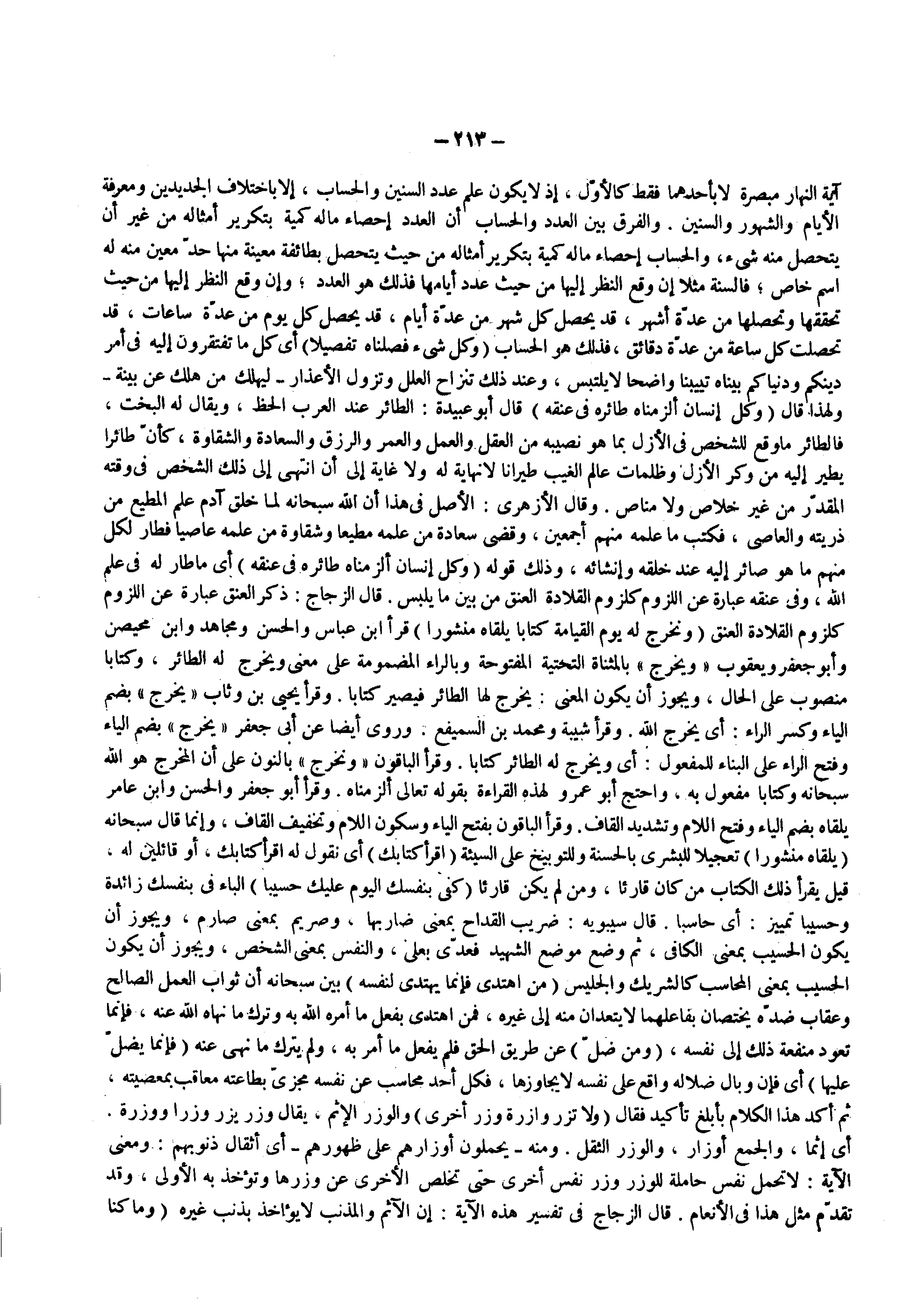 ولهذا قال ) وكل إنسان ألزمناه طائره في عنقه ( قال أبو عبيدة الطائر عند العرب الحظ ويقال له البخت فالطائر ما وقع للشخص فى الأزل بما هو نصيبه من العقل والعمل والعمر والرزق والسعادة والشقاوة كأن طائرا يطير إليه من وكر الأزل وظلمات عالم الغيب طيرانا لا نهاية له ولا غاية إلى أن انتهى إلى ذلك الشخص فى وقته المقدر من غير خلاص ولا مناص وقال الأزهري الأصل فى هذا أن الله سبحانه لما خلق آدم علم المطيع من ذريته والعاصي فكتب ما علمه منهم أجمعين وقضى سعادة من علمه مطيعا وشقاوة من علمه عاصيا فطار لكل منهم ما هو صائر إليه عند خلقه وإنشائه وذلك قوله ) وكل إنسان ألزمناه طائره في عنقه ( أى ما طار له فى علم الله وفى عنقه عبارة عن اللزوم كلزوم القلادة العنق من بين ما يلبس قال الزجاج ذكر العنق عبارة عن اللزوم كلزوم القلادة العنق ) ونخرج له يوم القيامة كتابا يلقاه منشورا ( قرأ ابن عباس والحسن ومجاهد وابن محيصن وأبو جعفر ويعقوب ويخرج بالمثناة التحتية المفتوحة وبالراء المضمومة على معنى ويخرج له الطائر وكتابا منصوب على الحال ويجوز أن يكون المعنى يخرج لها الطائر فيصير كتابا وقرأ يحيى بن وثاب يخرج بضم الياء وكسر الراء أى يخرج الله وقرأ شيبة ومحمد بن السميفع وروى أيضا عن أبي جعفر يخرج بضم الياء وفتح الراء على البناء للمفعول أى ويخرج له الطائر كتابا وقرأ الباقون ) ونخرج ( بالنون على أن المخرج هو الله سبحانه وكتابا مفعول به واحتج أبو عمرو لهذه القراءة بقوله تعالى ألزمناه وقرأ أبو جعفر والحسن وابن عامر يلقاه بضم الياء وفتح اللام وتشديد القاف وقرأ الباقون بفتح الياء وسكون اللام وتخفيف القاف وإنما قال سبحانه ) يلقاه منشورا ( تعجيلا للبشرى بالحسنة وللتوبيخ على السيئة