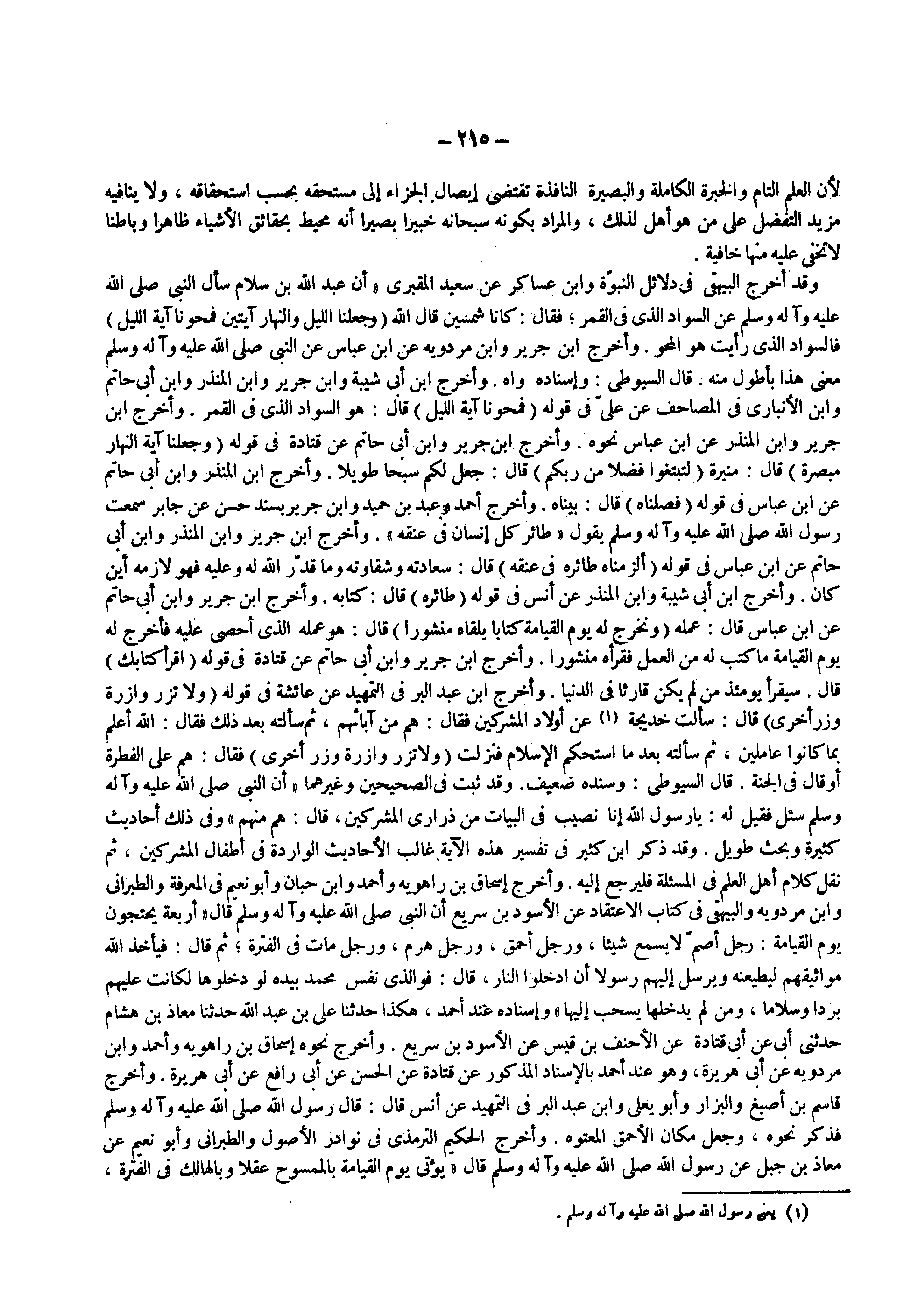 وقد أخرج البيهقى فى دلائل النبوة وابن عساكر عن سعيد المقبرى أن عبد الله بن سلام سأل النبى ( صلى الله عليه وسلم ) عن السواد الذى فى القمر فقال كانا شمسين قال الله ) وجعلنا الليل والنهار آيتين فمحونا آية الليل ( فالسواد الذى رأيت هو المحو وأخرج ابن جرير وابن مردويه عن ابن عباس عن النبى ( صلى الله عليه وسلم ) معنى هذا بأطول منه قال السيوطى وإسناده واه وأخرج ابن أبى شيبة وابن جرير وابن المنذر وابن أبى حاتم وابن الأنبارى فى المصاحف عن على فى قوله ) فمحونا آية الليل ( قال هو السواد الذى فى القمر وأخرج ابن جرير وابن المنذر عن ابن عباس نحوه وأخرج ابن جرير وابن أبى حاتم عن قتادة فى قوله ) وجعلنا آية النهار مبصرة ( قال منيرة ) لتبتغوا فضلا من ربكم ( قال جعل لكم سبحا طويلا وأخرج ابن المنذر وابن أبى حاتم عن ابن عباس فى قوله ) فصلناه ( قال بيناه وأخرج أحمد وعبد بن حميد وابن جرير بسند حسن عن جابر سمعت رسول الله ( صلى الله عليه وسلم ) يقول طائر كل إنسان فى عنقه وأخرج ابن جرير وابن المنذر وابن أبى حاتم عن ابن عباس فى قوله ) ألزمناه طائره في عنقه ( قال سعادته وشقاوته وما قدر الله له وعليه فهو لازمه أين كان وأخرج ابن أبى شيبة وابن المنذر عن أنس فى قوله ) طائره ( قال كتابه وأخرج ابن جرير وابن أبى حاتم عن ابن عباس قال عمله ) ونخرج له يوم القيامة كتابا يلقاه منشورا ( قال هو عمله الذى أحصى عليه فأخرج له يوم القيامة ما كتب له من العمل فقرأه منشورا وأخرج ابن جرير وابن أبى حاتم عن قتادة فى قوله ) اقرأ كتابك ( قال سيقرأ يومئذ من لم يكن قارئا فى الدنيا وأخرج ابن عبد البر فى التمهيد عن عائشة فى قوله ) ولا تزر وازرة وزر أخرى ( قال سألت خديجة عن أولاد المشركين فقال هم من آبائهم ثم سالته بعد ذلك فقال الله أعلم بما كانوا عاملين ثم سألته بعد ما استحكم الإسلام فنزلت ) ولا تزر وازرة وزر أخرى ( فقال هم على الفطرة أو قال فى الجنة قال السيوطى وسنده ضعيف وقد ثبت فى الصحيحين وغيرهما أن النبى ( صلى الله عليه وسلم ) سئل فقيل له يا رسول الله إنا نصيب فى البيات من ذرارى المشركين قال هم منهم وفى ذلك أحاديث كثيرة وبحث طويل وقد ذكر ابن كثير فى تفسير هذه الآية غالب الأحاديث الواردة فى أطفال المشركين ثم نقل كلام أهل العلم فى المسئلة فليرجع إليه وأخرج إسحاق بن راهويه وأحمد وابن حبان وأبو نعيم فى المعرفة والطبرانى وابن مردويه والبيهقى فى كتاب الإعتقاد عن الأسود بن سريع أن النبى ( صلى الله عليه وسلم ) قال أربعة يحتجون يوم القيامة رجل أصم لا يسمع شيئا ورجل أحمق ورجل هرم ورجل مات فى الفترة ثم قال فيأخذ الله مواثيقهم ليطيعنه ويرسل إليهم رسولا أن ادخلوا النار قال فوالذى نفس محمد بيده لو دخلوها لكانت عليهم بردا وسلاما ومن لم يدخلها يسحب إليها وإسناده عند أحمد هكذا حدثنا على بن عبد الله حدثنا معاذ ن هشام حدثنى أبى عن أبى قتادة عن الأحنف بن قيس عن الأسود بن سريع وأخرج نحوه إسحاق بن راهويه وأحمد وابن مردويه عن أبى هريرة وهو عند أحمد بالإسناد المذكور عن قتادة عن الحسن بن أبى رافع عن أبى هريرة وأخرج قاسم بن أصبغ والبزار وأبو يعلى وابن عبد البر فى التمهيد عن أنس قال قال رسول الله ( صلى الله عليه وسلم ) فذكر نحوه وجعل مكان الأحمق المعتوه وأخرج الحكيم الترمذى فى نوادر الأصول والطبرانى وأبو نعيم عن معاذ بن جبل عن رسول الله ( صلى الله عليه وسلم ) قال يؤتى يوم القيامة بالممسوح عقلا وبالهالك فى الفترة