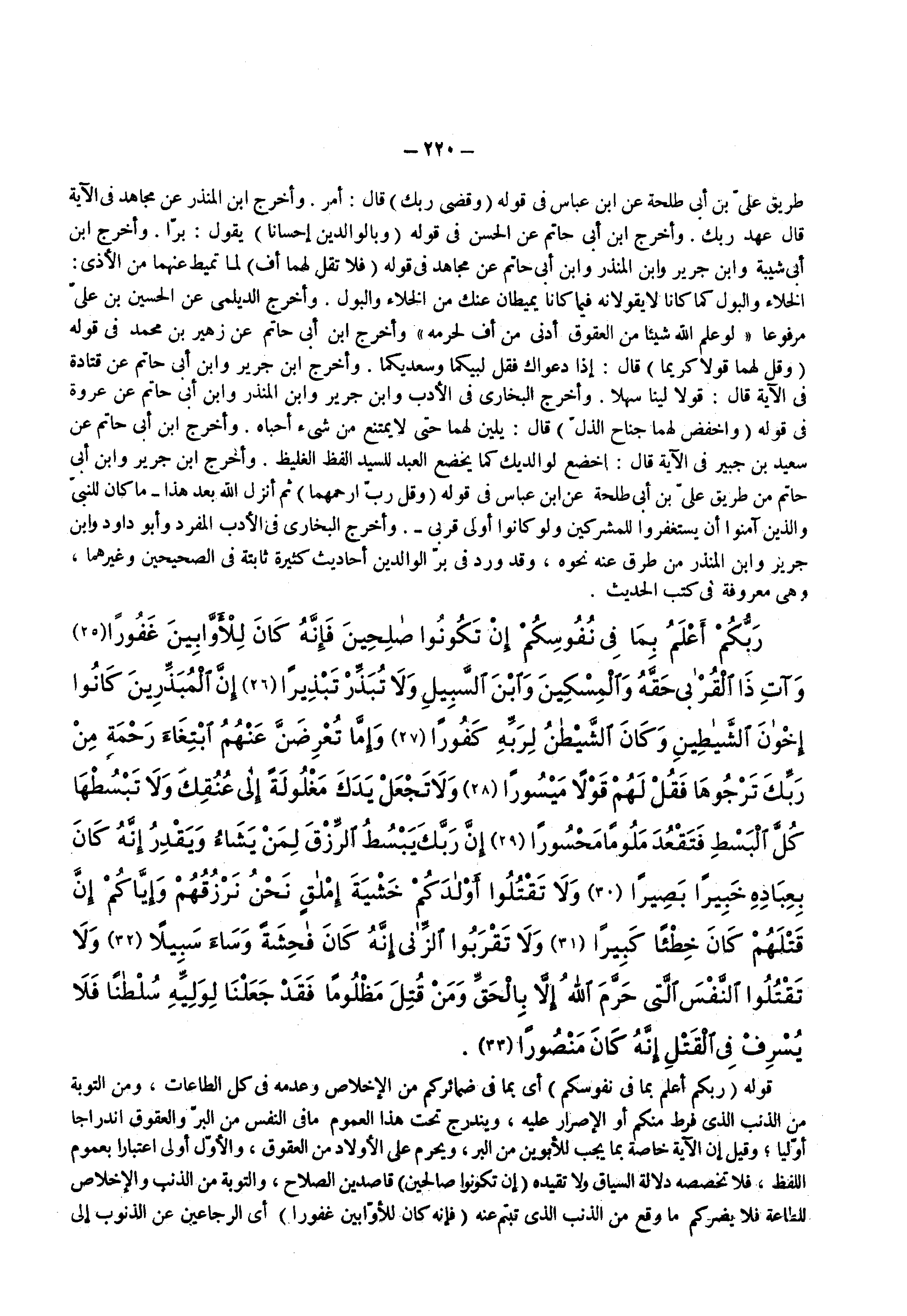 طريق علي بن أبي طلحة عن ابن عباس فى قوله ) وقضى ربك ( قال أمر وأخرج ابن المنذر عن مجاهد فى الآية قال عهد ربك وأخرج ابن أبي حاتم عن الحسن فى قوله ) وبالوالدين إحسانا ( يقول برا وأخرج ابن أبي شيبة وابن جرير وابن المنذر وابن أبي حاتم عن مجاهد فى قوله ) فلا تقل لهما أف ( لما تميط عنهما من الأذى الخلاء والبول كما كانا لا يقولانه فيما كانا يميطان عنك من الخلاء والبول وأخرج الديلمي عن الحسين بن علي مرفوعا لو علم الله شيئا من العقوق أدنى من أف لحرمه وأخرج ابن أبي حاتم عن زهير بن محمد فى قوله ) وقل لهما قولا كريما ( قال إذا دعواك فقل لبيكما وسعديكما وأخرج ابن جرير وابن أبي حاتم عن قتادة فى الآية قال قولا لينا سهلا وأخرج البخاري فى الأدب وابن جرير وابن المنذر وابن أبي حاتم عن عروة فى قوله ) واخفض لهما جناح الذل ( قال يلين لهما حتى لا يمتنع من شئ أحباه وأخرج ابن أبي حاتم عن سعيد بن جبير فى الآية قال اخضع لوالديك كما يخضع العبد للسيد الفظ الغليظ وأخرج ابن جرير وابن أبي حاتم من طريق علي بن أبي طلحة عن ابن عباس فى قوله ) وقل رب ارحمهما ( ثم أنزل الله بعد هذا ) ما كان للنبي والذين آمنوا أن يستغفروا للمشركين ولو كانوا أولي قربى ( وأخرج البخاري فى الأدب المفرد وأبو داود وابن جرير وابن المنذر من طرق عنه نحوه وقد ورد فى بر الوالدين أحاديث كثيرة ثابتة فى الصحيحين وغيرهما وهى معروفة فى كتب الحديث