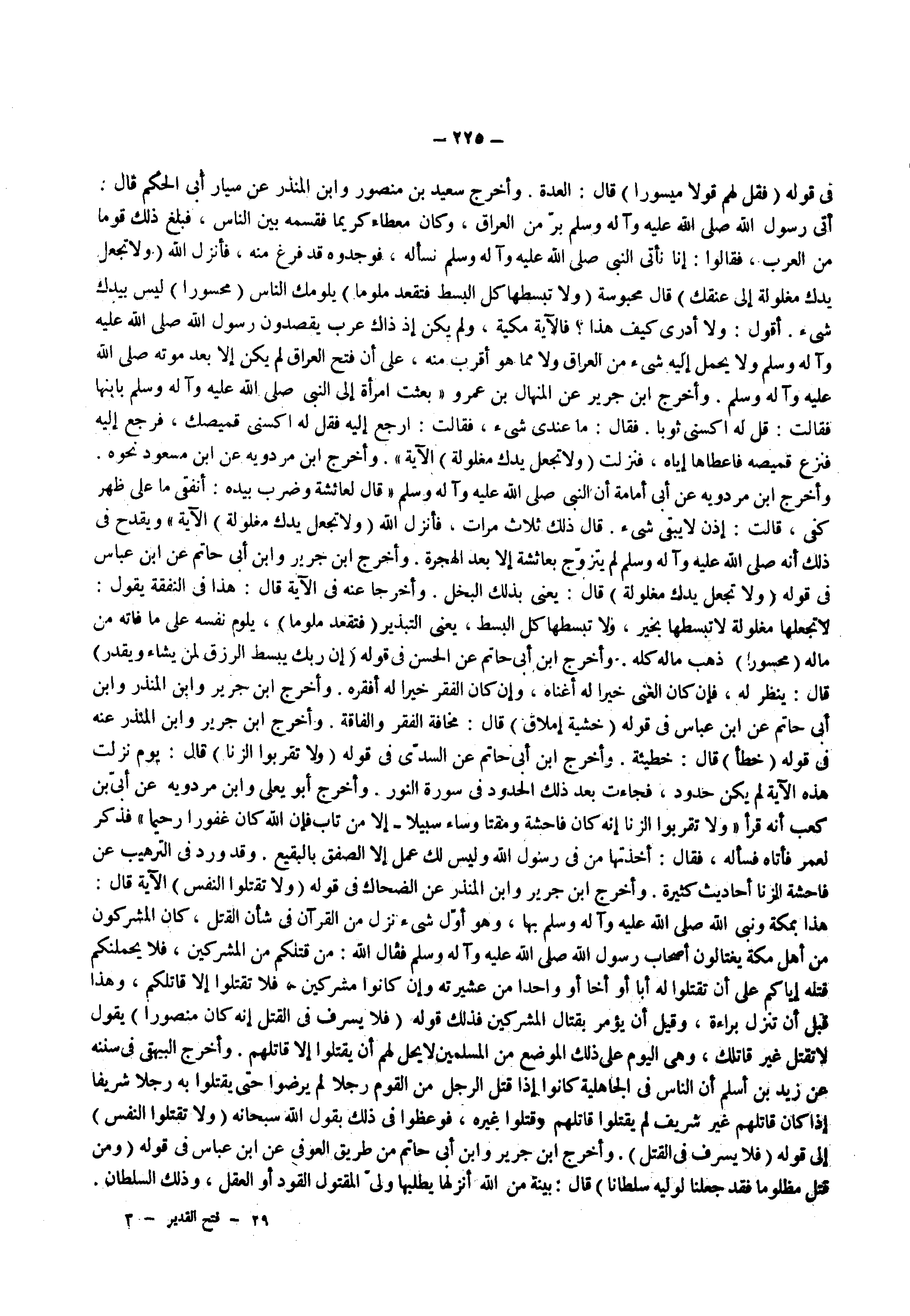 فى قوله ) فقل لهم قولا ميسورا ( قال العدة وأخرج سعيد بن منصور وابن المنذر عن سيار أبي الحكم قال أتى رسول الله ( صلى الله عليه وسلم ) بر من العراق وكان معطاء كريما فقسمه بين الناس فبلغ ذلك قوما من العرب فقالوا إنا نأتي النبي ( صلى الله عليه وسلم ) نسأله فوجدوه قد فرغ منه فأنزل الله ) ولا تجعل يدك مغلولة إلى عنقك ( قال محبوسة ) ولا تبسطها كل البسط فتقعد ملوما ( يلومك الناس ) محسورا ( ليس بيدك شيء أقول ولا أدري كيف هذا فالآية مكية ولم يكن إذ ذاك عرب يقصدون رسول الله ( صلى الله عليه وسلم ) ولا يحمل إليه شيء من العراق ولا مما هو أقرب منه على أن فتح العراق لم يكن إلا بعد موته ( صلى الله عليه وسلم ) وأخرج ابن جرير عن المنهال بن عمرو بعثت امرأة إلى النبي ( صلى الله عليه وسلم ) بابنها فقالت قل له اكسني ثوبا فقال ما عندي شيء فقالت ارجع إليه فقل له اكسني قميصك فرجع إليه فنزع قميصه فاعطاها إياه فنزلت ) ولا تجعل يدك مغلولة ( الآية وأخرج ابن مردويه عن ابن مسعود نحوه وأخرج ابن مردويه عن أبي أمامة أن النبي ( صلى الله عليه وسلم ) قال لعائشة وضرب بيده أنفقي ما على ظهر كفي قالت إذن لا يبقى شيء قال ذلك ثلاث مرات فأنزل الله ) ولا تجعل يدك مغلولة ( الآية ويقدح فى ذلك أنه ( صلى الله عليه وسلم ) لم يتزوج بعائشة إلا بعد الهجرة وأخرج ابن جرير وابن أبي حاتم عن ابن عباس فى قوله ) ولا تجعل يدك مغلولة ( قال يعني بذلك البخل وأخرجا عنه فى الآية قال هذا فى النفقة يقول لا تجعلها مغلولة لا تبسطها بخير ولا تبسطها كل البسط يعني التبذير ) فتقعد ملوما ( يلوم نفسه على ما فاته من ماله ) محسورا ( ذهب ماله كله وأخرج ابن أبي حاتم عن الحسن فى قوله ) إن ربك يبسط الرزق لمن يشاء ويقدر ( قال ينظر له فإن كان الغني خيرا له أغناه وإن كان الفقر خيرا له أفقره وأخرج ابن جرير وابن المنذر وابن أبي حاتم عن ابن عباس فى قوله ) خشية إملاق ( قال مخافة الفقر والفاقة وأخرج ابن جرير وابن المنذر عنه فى قوله ) خطأ ( قال خطيئة وأخرج ابن أبي حاتم عن السدي فى قوله ) ولا تقربوا الزنى ( قال يوم نزلت هذه الآية لم يكن حدود فجاءت بعد ذلك الحدود فى سورة النور وأخرج أبو يعلى وابن مردويه عن أبي بن كعب أنه قرأ ? ولا تقربوا الزنا إنه كان فاحشة ومقتا وساء سبيلا ? ) إلا من تاب وآمن وعمل عملا صالحا فأولئك يبدل الله سيئاتهم حسنات وكان الله غفورا رحيما ( فذكر لعمر فأتاه فسأله فقال أخذتها من فى رسول الله وليس لك عمل إلا الصفق بالبقيع وقد ورد فى الترهيب عن فاحشة الزنا أحاديث كثيرة وأخرج ابن جرير وابن المنذر عن الضحاك فى قوله ) ولا تقتلوا النفس ( الآية قال هذا بمكة ونبي الله ( صلى الله عليه وسلم ) بها وهو أول شيء نزل من القرآن فى شأن القتل كان المشركون من أهل مكة يغتالون أصحاب رسول الله ( صلى الله عليه وسلم ) فقال الله من قتلكم من المشركين فلا يحملنكم قتله إياكم على أن تقتلوا له أبا أو أخا أو واحدا من عشيرته وإن كانوا مشركين فلا تقتلوا إلا قاتلكم وهذا قبل أن تنزل براءة وقيل أن يؤمر بقتال المشركين فذلك قوله ) فلا يسرف في القتل إنه كان منصورا ( يقول لا تقتل غير قاتلك وهى اليوم على ذلك الموضع من المسلمين لا يحل لهم أن يقتلوا إلا قاتلهم وأخرج البيهقي فى سننه عن زيد بن أسلم أن الناس فى الجاهلية كانوا إذا قتل الرجل من القوم رجلا لم يرضوا حتى يقتلوا به رجلا شريفا إذا كان قاتلهم غير شريف لم يقتلوا قاتلهم وقتلوا غيره فوعظوا فى ذلك بقول الله سبحانه ) ولا تقتلوا النفس ( إلى قوله ) فلا يسرف في القتل ( وأخرج ابن جرير وابن أبي حاتم من طريق العوفي عن ابن عباس فى قوله ) ومن قتل مظلوما فقد جعلنا لوليه سلطانا ( قال بينة من الله أنزلها يطلبها ولي المقتول القود أو العقل وذلك السلطان