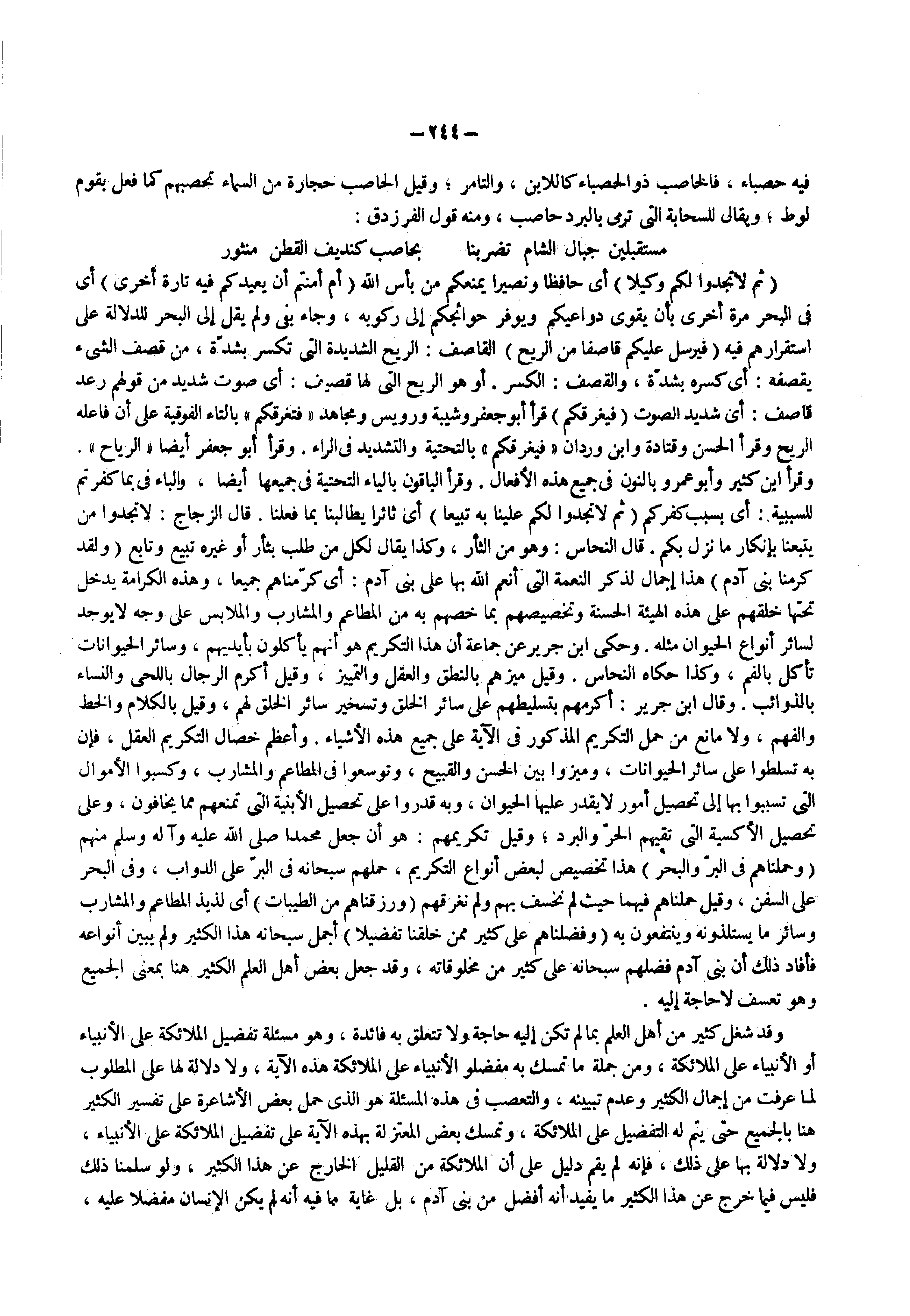 وقد شغل كثير من أهل العلم بما لم تكن إليه حاجة ولا تتعلق به فائدة وهو مسئلة تفضيل الملائكة على الأنبياء أو الأنبياء على الملائكة ومن جملة ما تمسك به مفضلوا الأنبياء على الملائكة هذه الآية ولا دلالة لها على المطلوب لما عرفت من إجمال الكثير وعدم تبيينه والتعصب فى هذه المسئلة هو الذى حمل بعض الأشاعرة على تفسير الكثير هنا بالجميع حتى يتم له التفضيل على الملائكة وتمسك بعض المعتزلة بهذه الآية على تفضيل الملائكة على الأنبياء ولا دلالة بها على ذلك فإن لم يقم دليل على أن الملائكة من القليل الخارج عن هذا الكثير ولو سلمنا ذلك فليس فيما خرج عن هذا الكثير ما يفيد أنه أفضل من بني آدم بل غاية ما فيه أنه لم يكن الإنسان مفضلا عليه