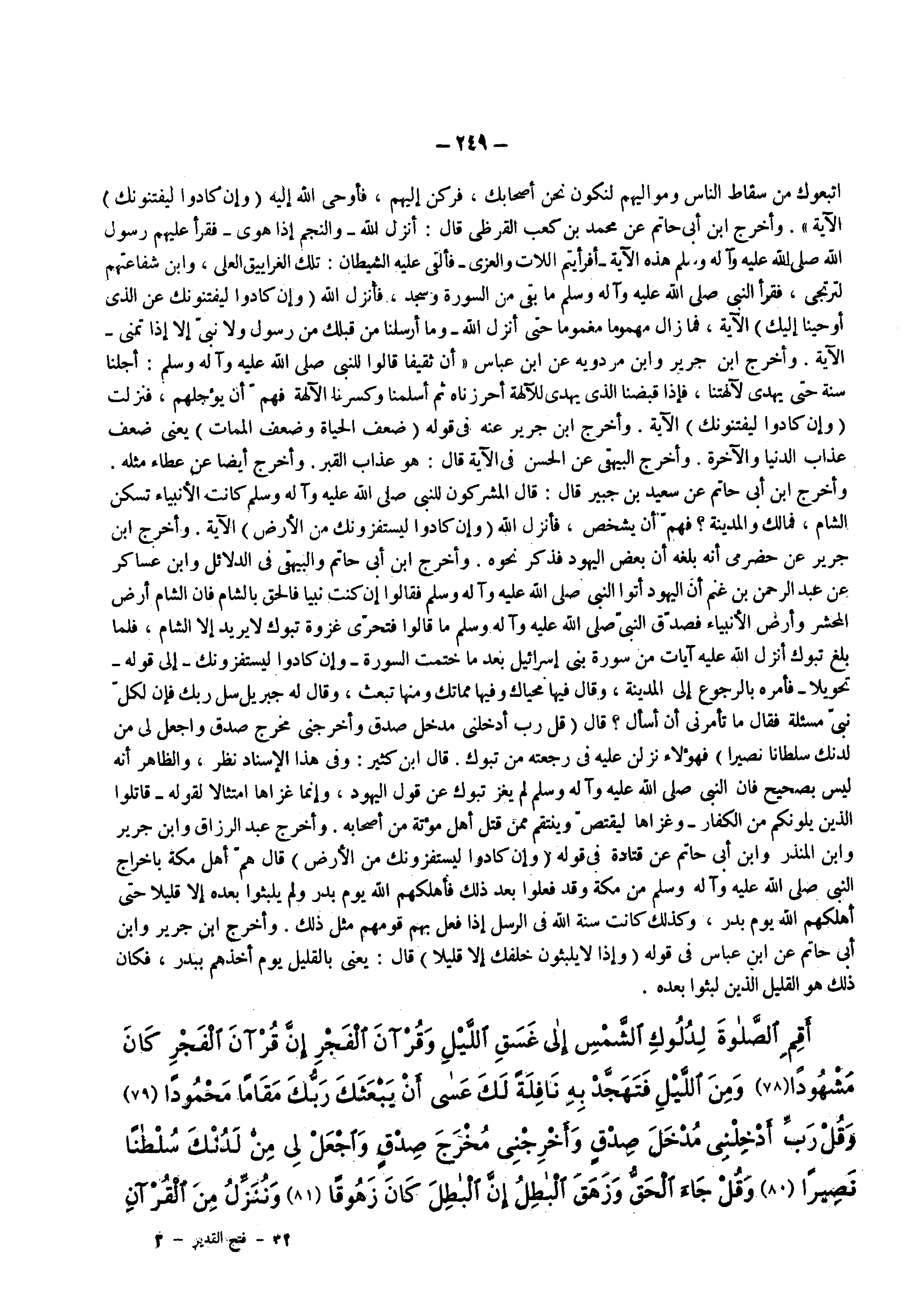 اتبعوك من سقاط الناس ومواليهم لنكون نحن أصحابك فركن إليهم فأوحى الله إليه ) وإن كادوا ليفتنونك ( الآية وأخرج ابن أبي حاتم عن محمد بن كعب القرظي قال أنزل الله ) والنجم إذا هوى ( فقرأ عليهم رسول الله ( صلى الله عليه وسلم ) هذه الآية ) أفرأيتم اللات والعزى ( فألقى عليه الشيطان تلك الغراييق العلى وابن شفاعتهم لترتجى فقرأ النبي ( صلى الله عليه وسلم ) ما بقى من السورة وسجد فأنزل الله ) وإن كادوا ليفتنونك عن الذي أوحينا إليك ( الآية فما زال مهموما مغموما حتى أنزل الله ) وما أرسلنا من قبلك من رسول ولا نبي إلا إذا تمنى ( الآية وأخرج ابن جرير وابن مردويه عن ابن عباس أن ثقيفا قالوا للنبي ( صلى الله عليه وسلم ) أجلنا سنة حتى يهدي لآلهتنا فإذا قبضنا الذى يهدي للآلهة أحرزناه ثم أسلمنا وكسرنا الآلهة فهم أن يؤجلهم فنزلت ) وإن كادوا ليفتنونك ( الآية وأخرج ابن جرير عنه فى قوله ) ضعف الحياة وضعف الممات ( يعنى ضعف عذاب الدنيا والآخرة وأخرج البيهقي عن الحسن فى الآية قال هو عذاب القبر وأخرج أيضا عن عطاء مثله وأخرج ابن أبي حاتم عن سعيد بن جبير قال قال المشركون للنبي ( صلى الله عليه وسلم ) كانت الأنبياء تسكن الشام فمالك والمدينة فهم أن يشخص فأنزل الله ) وإن كادوا ليستفزونك من الأرض ( الآية وأخرج ابن جرير عن حضرمي أنه بلغه أن بعض اليهود فذكر نحوه وأخرج ابن أبي حاتم والبيهقي فى الدلائل وابن عساكر عن عبد الرحمن بن غنم أن اليهود أتوا النبي ( صلى الله عليه وسلم ) فقالوا إن كنت نبيا فالحق بالشام فإن الشام أرض المحشر وأرض الأنبياء فصدق النبي ( صلى الله عليه وسلم ) ما قالوا فتحرى غزوة تبوك لا يريد إلا الشام فلما بلغ تبوك أنزل الله عليه آيات من سورة بني إسرائيل بعد ما ختمت السورة ) وإن كادوا ليستفزونك ( إلى قوله ) تحويلا ( فأمره بالرجوع إلى المدينة وقال فيها محياك وفيها مماتك ومنها تبعث وقال له جبريل سل ربك فإن لكل نبي مسئلة فقال ما تأمرني أن أسأل قال ) وقل رب أدخلني مدخل صدق وأخرجني مخرج صدق واجعل لي من لدنك سلطانا نصيرا ( فهؤلاء نزلن عليه فى رجعته من تبوك قال ابن كثير وفى هذا الإسناد نظر والظاهر أنه ليس بصحيح فإن النبي ( صلى الله عليه وسلم ) لم يغز تبوك عن قول اليهود وإنما غزاها امتثالا لقوله ) قاتلوا الذين يلونكم من الكفار ( وغزاها ليقتص وينتقم ممن قتل أهل مؤتة من أصحابه وأخرج عبد الرزاق وابن جرير وابن المنذر وابن أبي حاتم عن قتادة فى قوله ) وإن كادوا ليستفزونك من الأرض ( قال هم أهل مكة بإخراج النبي ( صلى الله عليه وسلم ) من مكة وقد فعلوا بعد ذلك فأهلكهم الله يوم بدر ولم يلبثوا بعده إلا قليلا حتى أهلكهم الله يوم بدر وكذلك كانت سنة الله فى الرسل إذا فعل بهم قومهم مثل ذلك وأخرج ابن جرير وابن أبي حاتم عن ابن عباس فى قوله ) وإذا لا يلبثون خلافك إلا قليلا ( قال يعني بالقليل يوم أخذهم ببدر فكان ذلك هو القليل الذين لبثوا بعده
