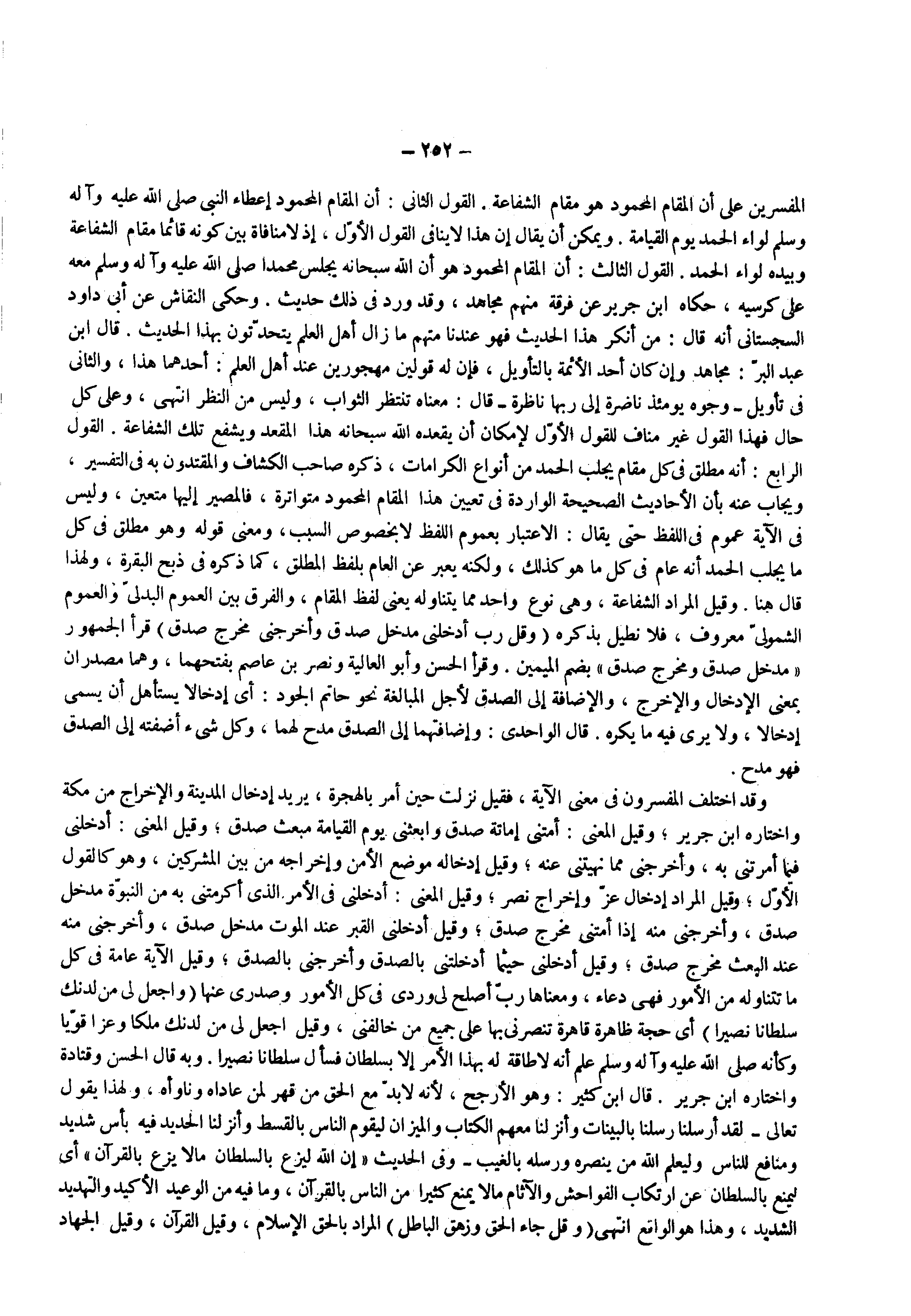 وقد اختلف المفسرون فى معنى الآية فقيل نزلت حين أمر بالهجرة يريد إدخال المدينة والإخراج من مكة واختاره ابن جرير وقيل المعنى أمتنى إماتة صدق وابعثنى يوم القيامة مبعث صدق وقيل المعنى أدخلني فيما أمرتني به وأخرجني مما نهيتني عنه وقيل إدخاله موضع الأمن وإخراجه من بين المشركين وهو كالقول الأول وقيل المراد إدخال عز وإخراج نصر وقيل المعنى أدخلني فى الأمر الذى أكرمتني به من النبوة مدخل صدق واخرجني منه إذا أمتني مخرج صدق وقيل أدخلني القبر عند الموت مدخل صدق وأخرجني منه عند البعث مخرج صدق وقيل أدخلني حيثما أدخلتني بالصدق وأخرجني بالصدق وقيل الآية عامة فى كل ما تتناوله من الأمور فهى دعاء ومعناها رب أصلح لي وردي فى كل الأمور وصدري عنها ) واجعل لي من لدنك سلطانا نصيرا ( أى حجة ظاهرة قاهرة تنصرني بها على جميع من خالفني وقيل اجعل لي من لدنك ملكا وعزا قويا وكأنه ( صلى الله عليه وسلم ) علم أنه لا طاقة له بهذا الأمر إلا بسلطان فسأل سلطانا نصيرا وبه قال الحسن وقتادة واختاره ابن جرير قال ابن كثير وهو الأرجح لأنه لا بد مع الحق من قهر لمن عاداه وناوأه ولهذا يقول تعالى ) لقد أرسلنا رسلنا بالبينات وأنزلنا معهم الكتاب والميزان ليقوم الناس بالقسط وأنزلنا الحديد فيه بأس شديد ومنافع للناس وليعلم الله من ينصره ورسله بالغيب ( وفى الحديث إن الله ليزع بالسلطان ما لا يزع بالقرآن أى ليمنع بالسلطان عن ارتكاب الفواحش والآثام ما لا يمنع كثيرا من الناس بالقرآن وما فيه من الوعيد الأكيد والتهديد الشديد وهذا هو الواقع انتهى